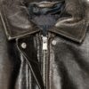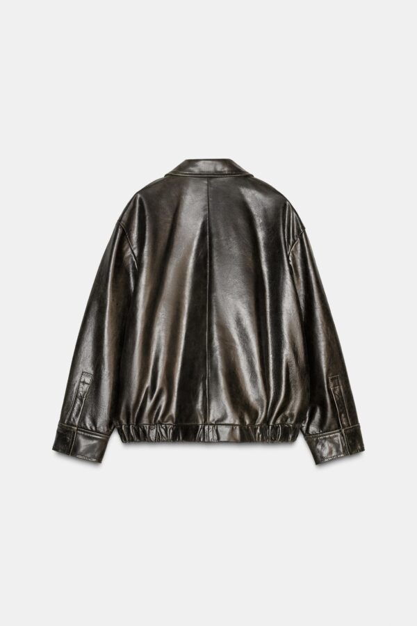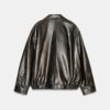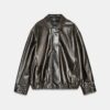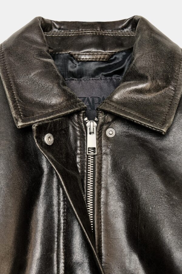 Bomber jacket made from 100% leather. Lapel collar and long sleeve with cuff. Front pockets. Elasticated hem. Inner lining. Front zip fastening with hidden buttons on the placket.