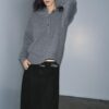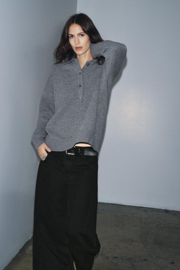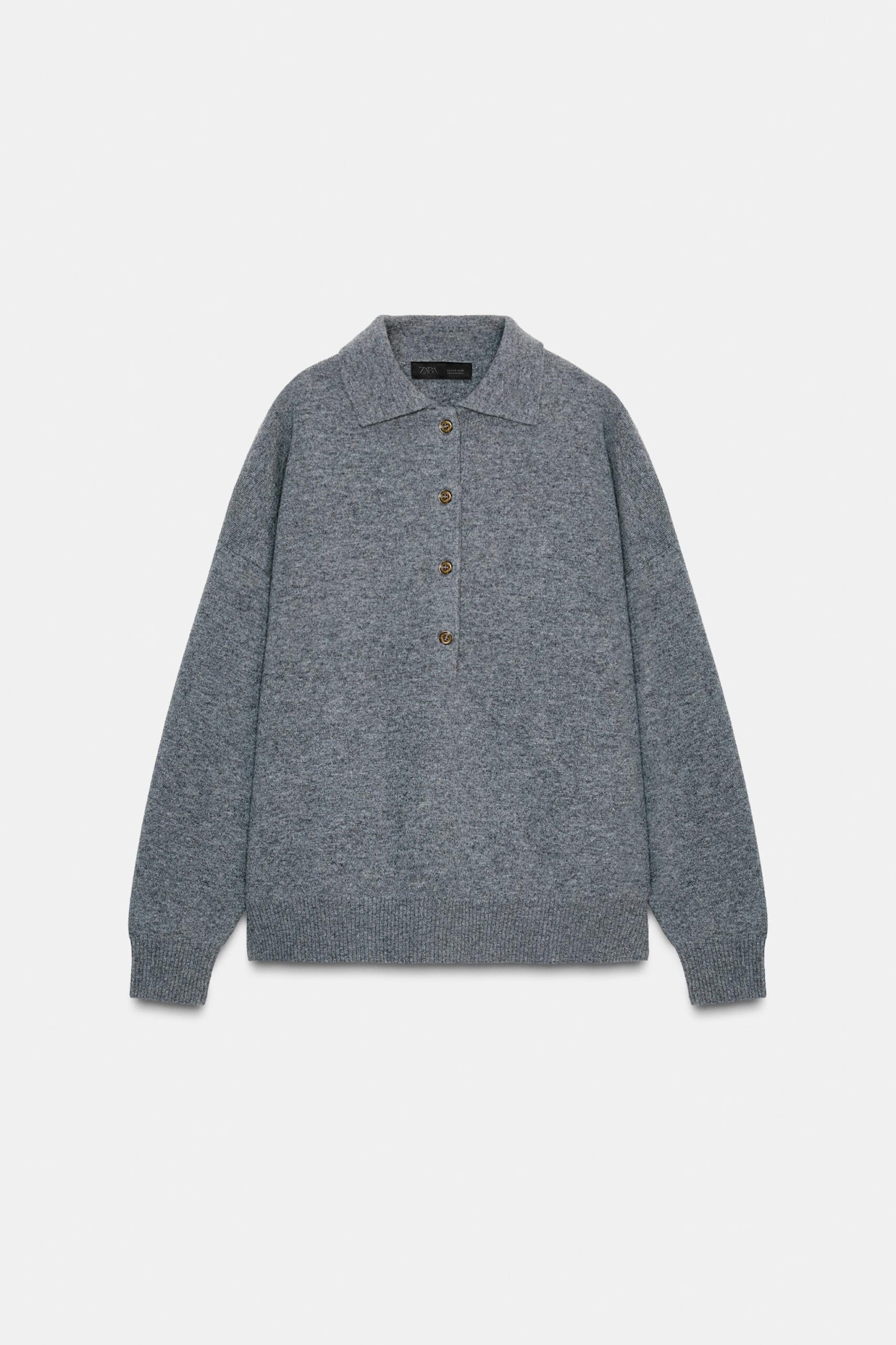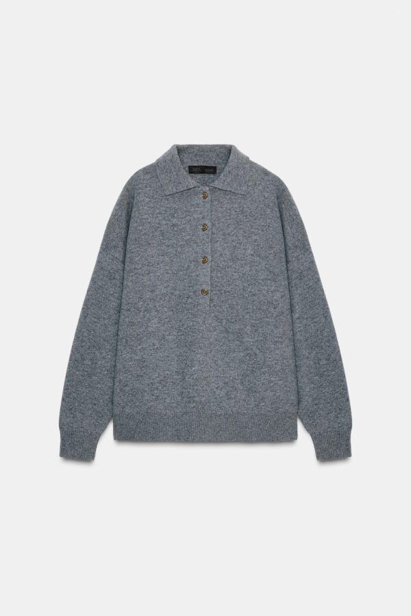 95% wool jumper with a polo collar and long sleeves. Front buttons.