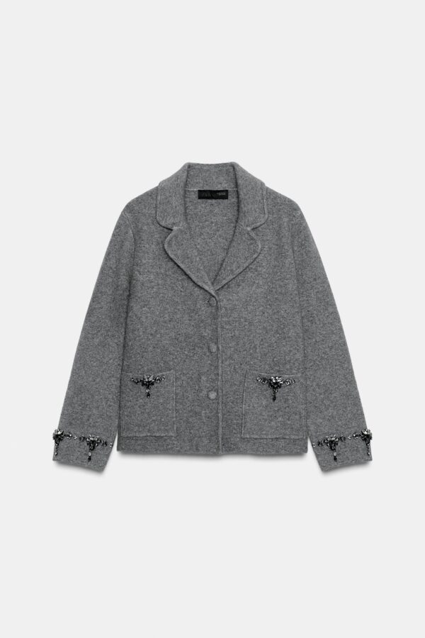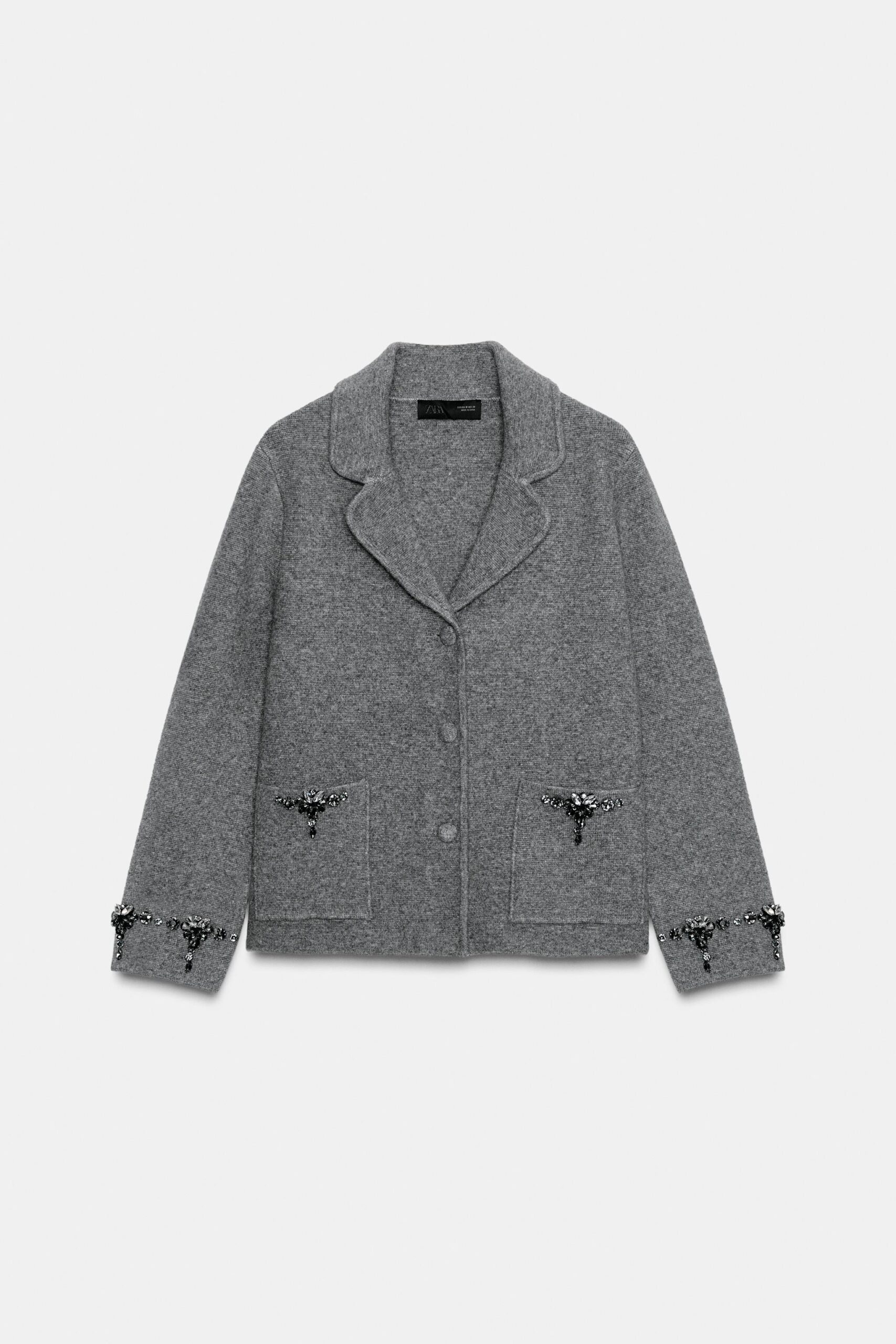 Plain knit cardigan with a lapel collar and long sleeves. Featuring front patch pockets and jewel bead trim. Front fastening with tone-on-tone covered buttons.