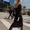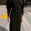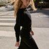Boat neck dress with long cuffed sleeves and a wide armhole. Featuring a fitted waist and a thin belt.