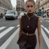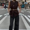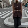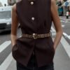 Round neck sleeveless waistcoat. Featuring front pockets, a belt detail and front button fastening.