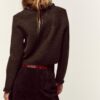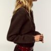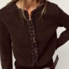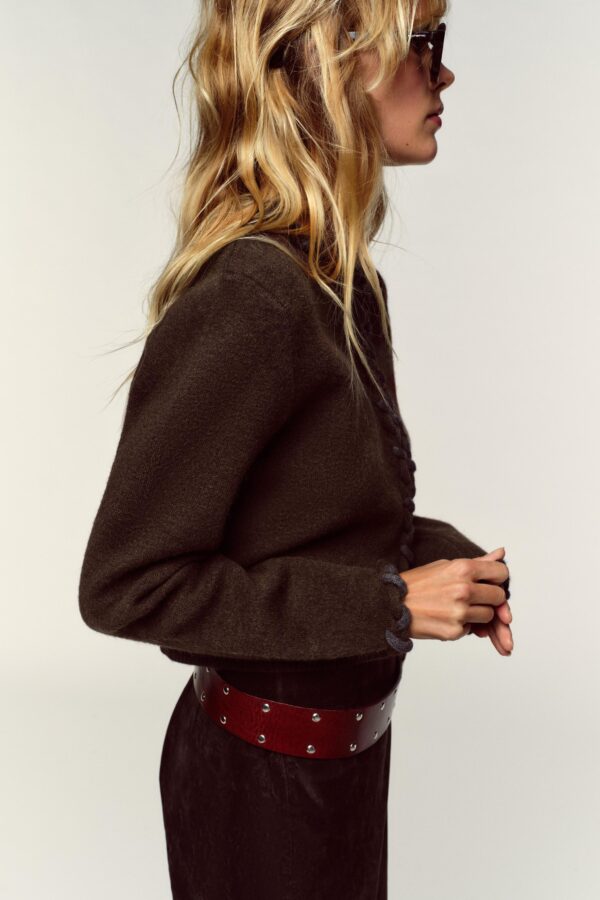 Cardigan with a round neck and long sleeves. Features interwoven trims. Concealed hook-and-eye fastening at the front.
