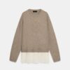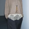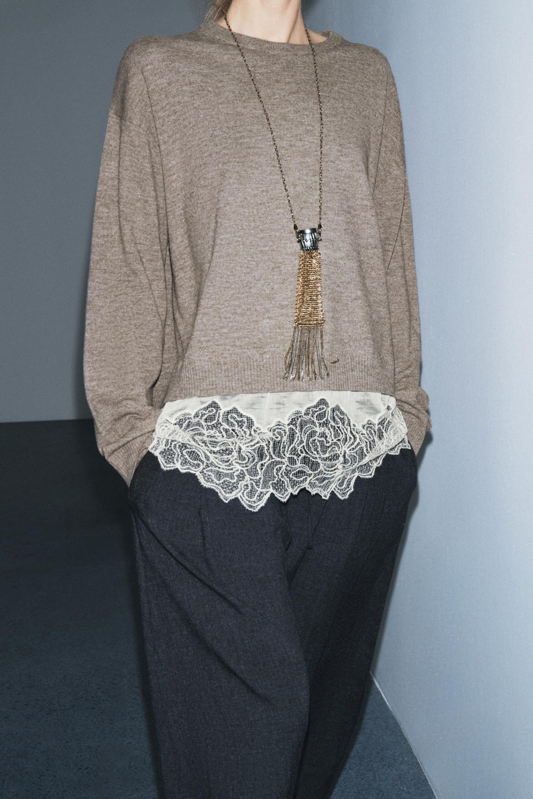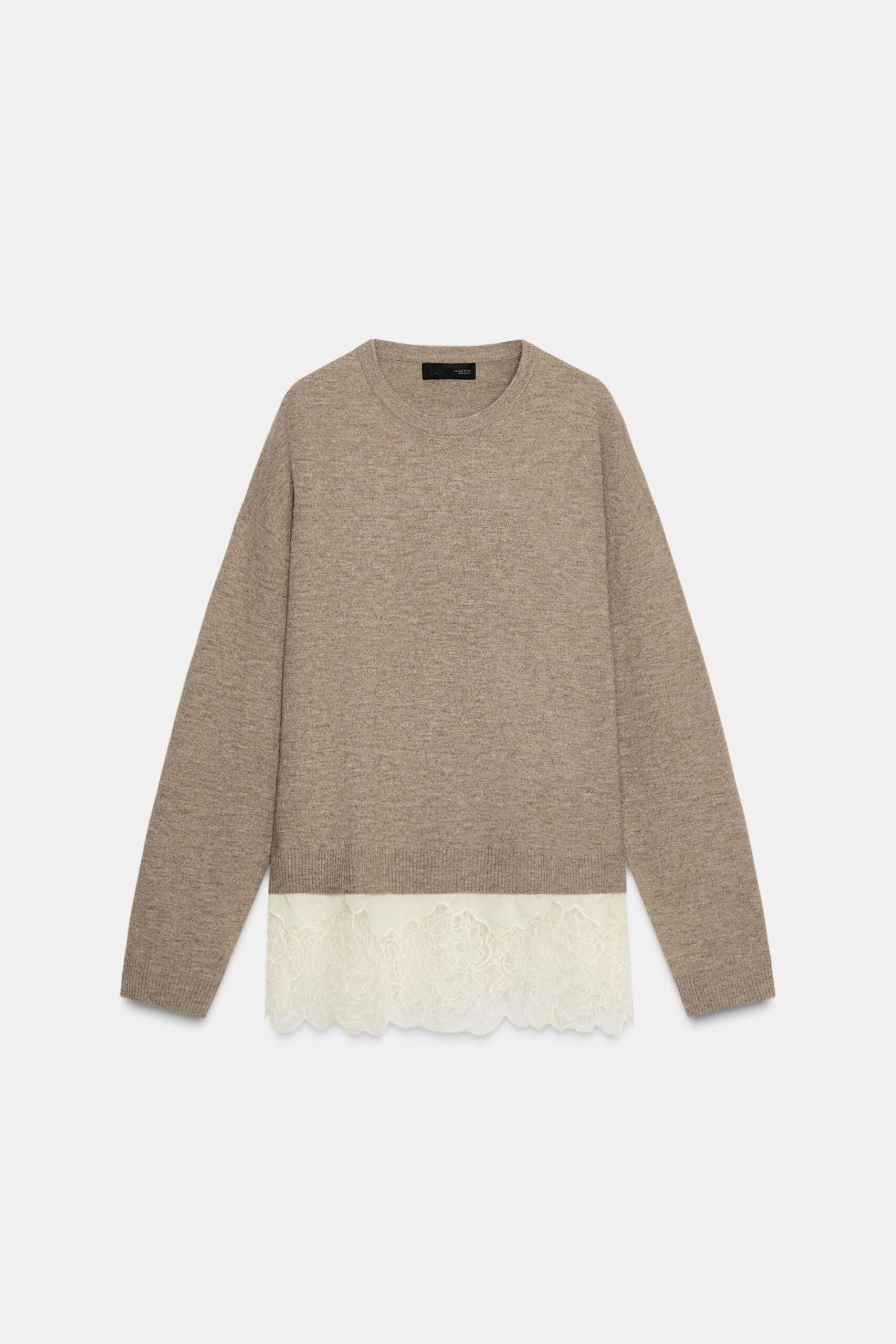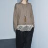 Plain knit jumper with a round neck and long sleeves. Hem finished with combined lace fabric.