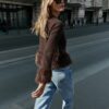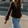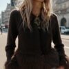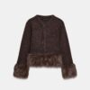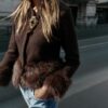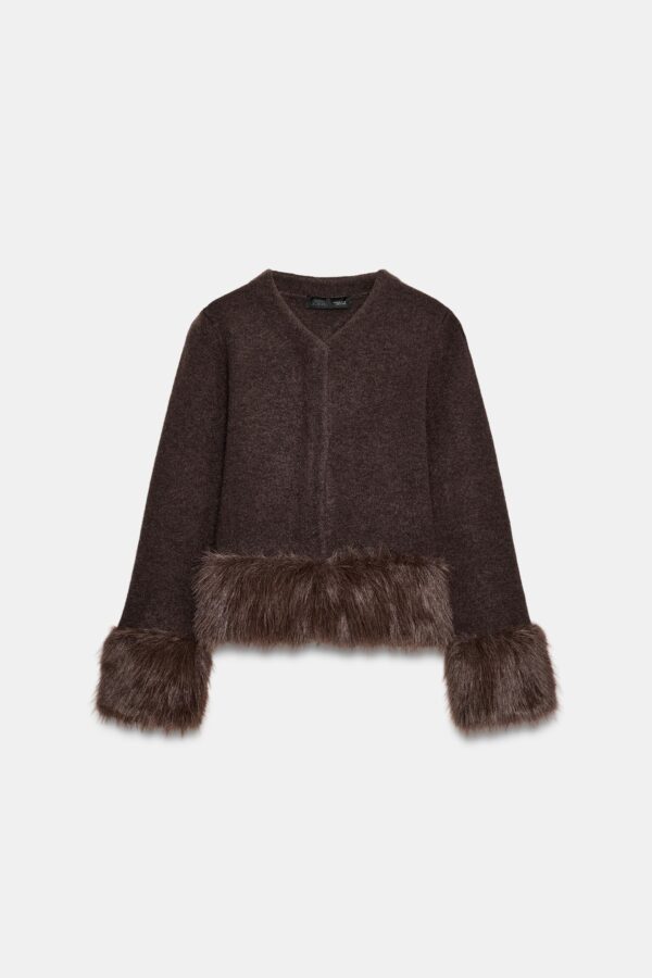 Cardigan with a V-neckline and long sleeves. Features faux fur contrast fabric trim. Front fastening with concealed snap buttons.