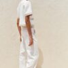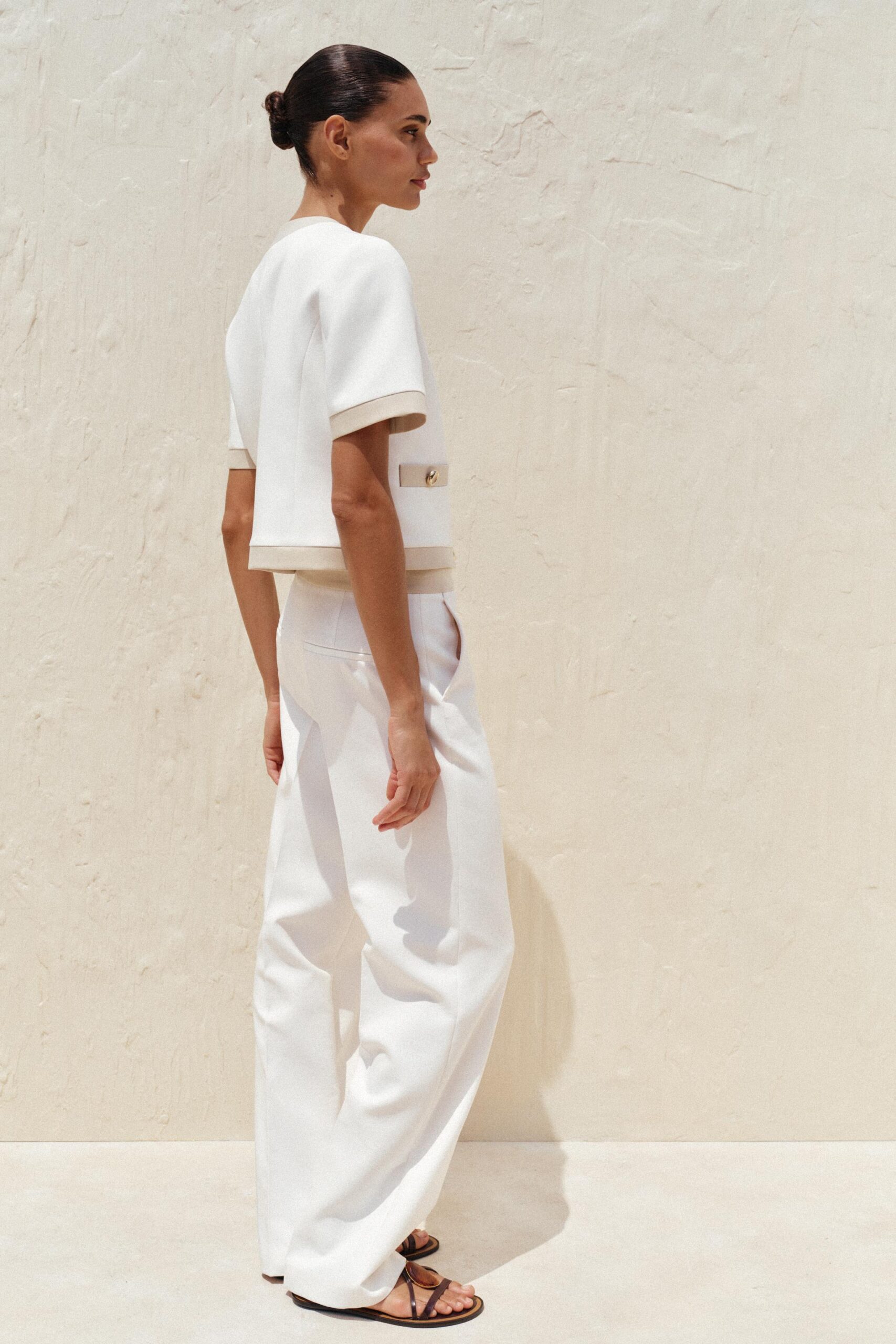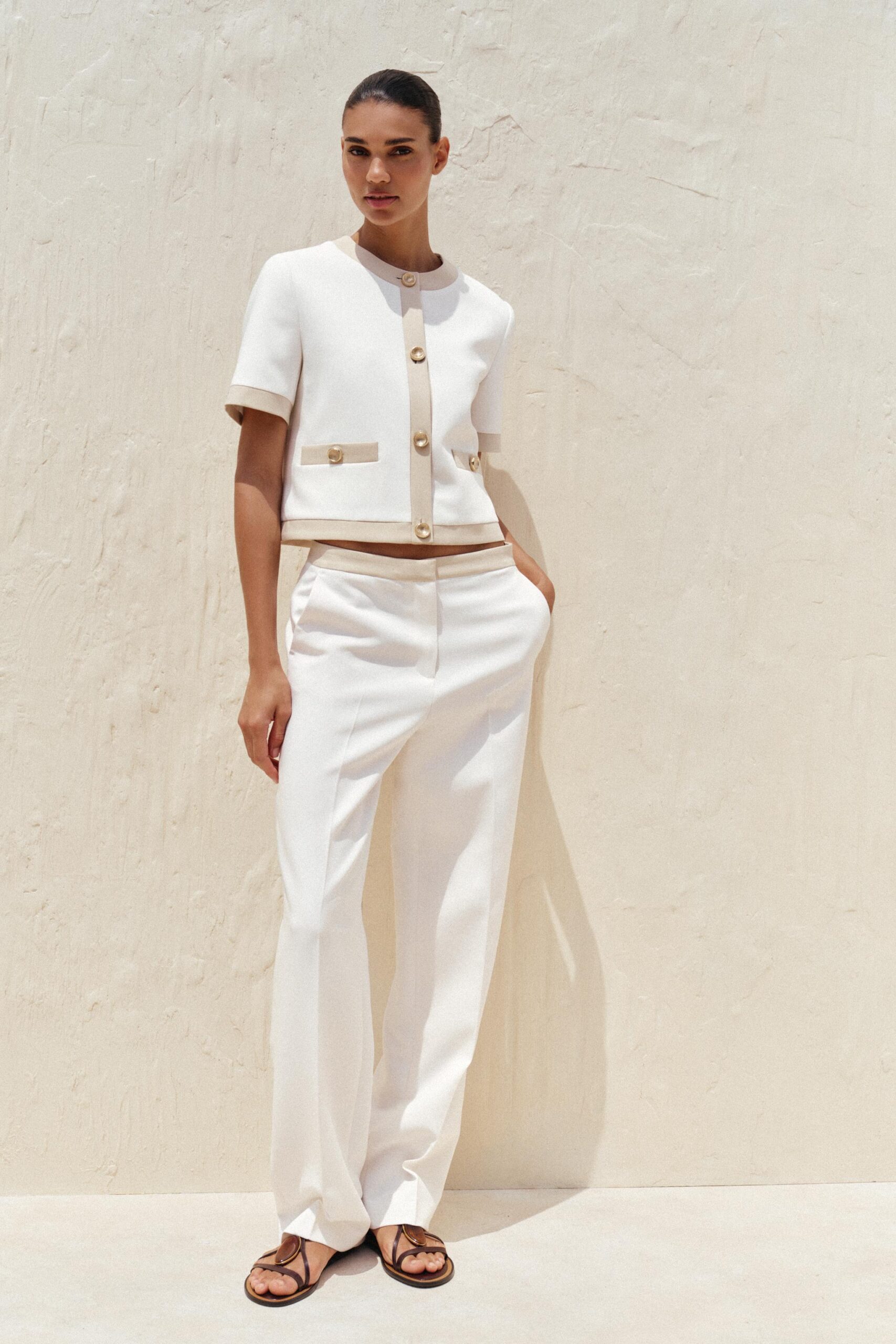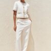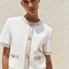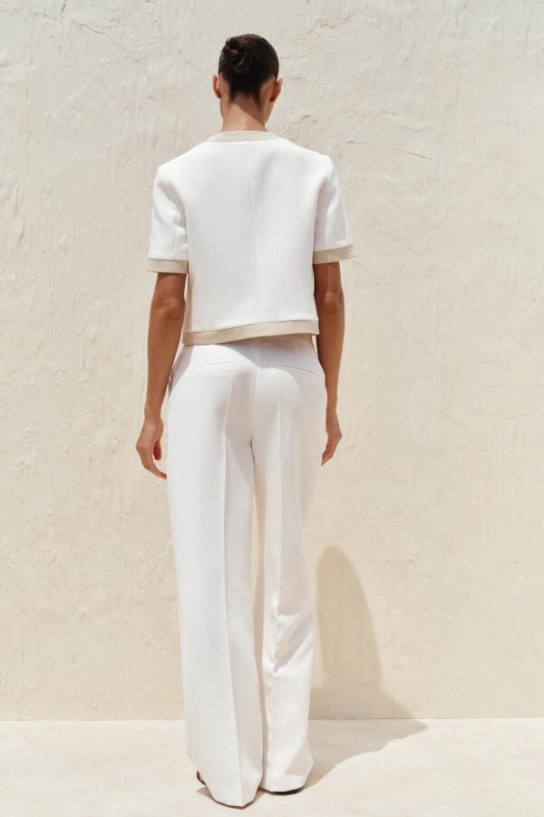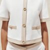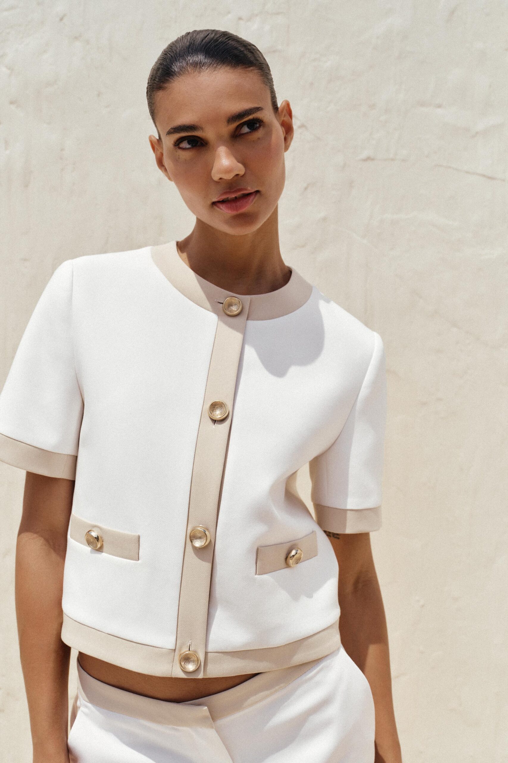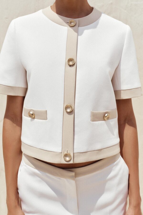 Round neck, short sleeve blazer. Front welt pockets. Front button fastening.