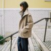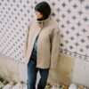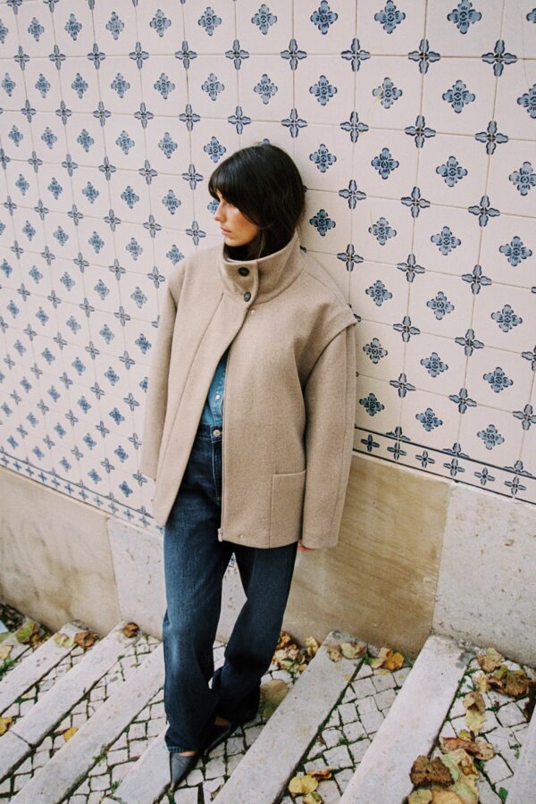 Coat made from wool. Featuring a high neck and long sleeves. Front patch pockets. Front zip and button fastening concealed by a placket.