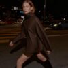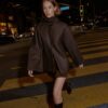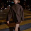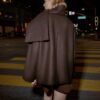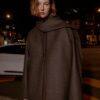 Cropped coat made of wool. Featuring a round neck with a detachable scarf with a hidden button and long sleeves. Front welt pockets. Front button fastening.