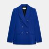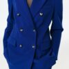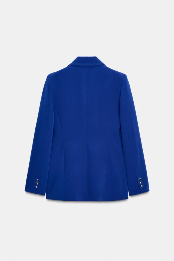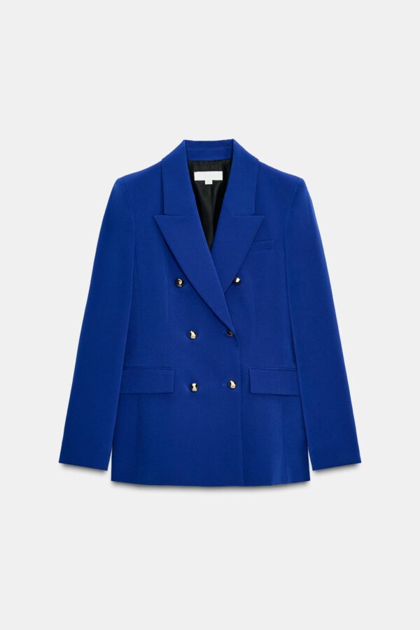 Fitted blazer with a lapel collar and long sleeves with shoulder pads. Featuring front flap pockets and double-breasted button fastening.