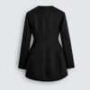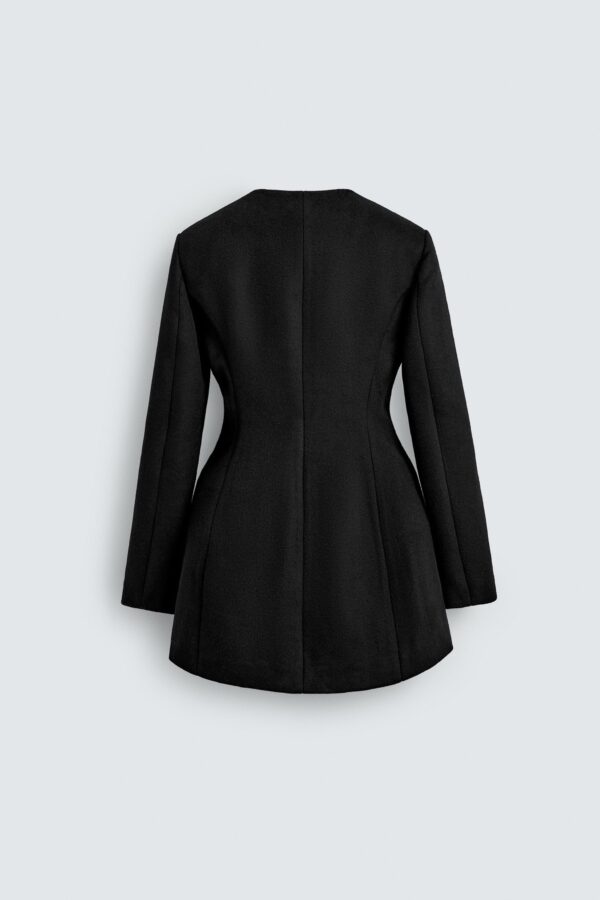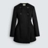 Coat dress made from a fabric with 52% wool. Fitted silhouette with a bouffant hip. Round neck and long sleeve. Double-breasted front fastening with oversize buttons.