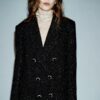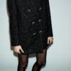 Long sleeve blazer with a lapel collar and shoulder pads. Featuring front flap pockets. Fabric with metallic thread. Double-breasted button fastening at the front.