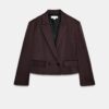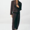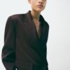 Short blazer with satin fabric. Lapel collar and long sleeves with shoulder pads. Front flap pockets. Double-breasted front fastening with self-covered buttons.