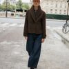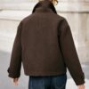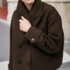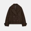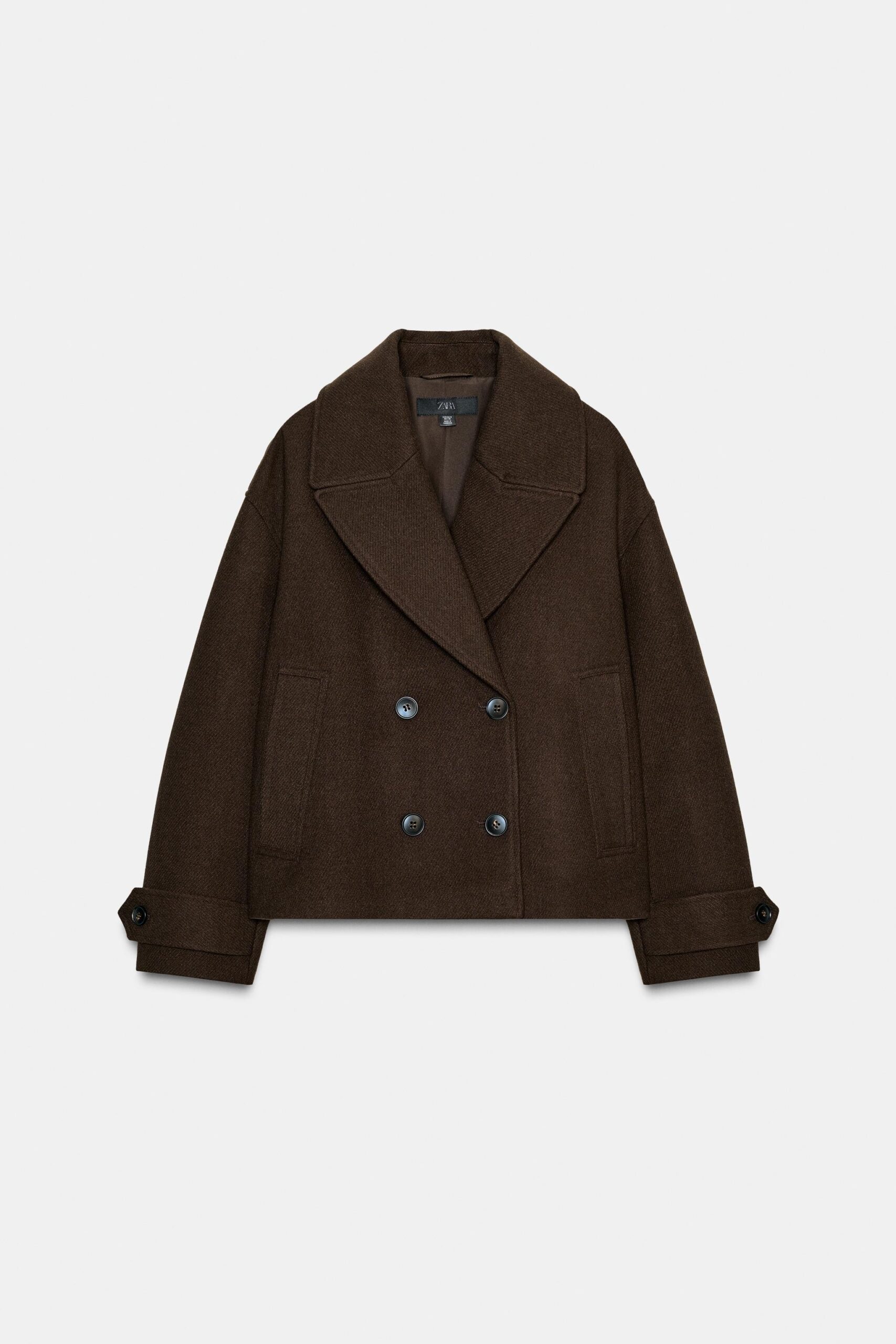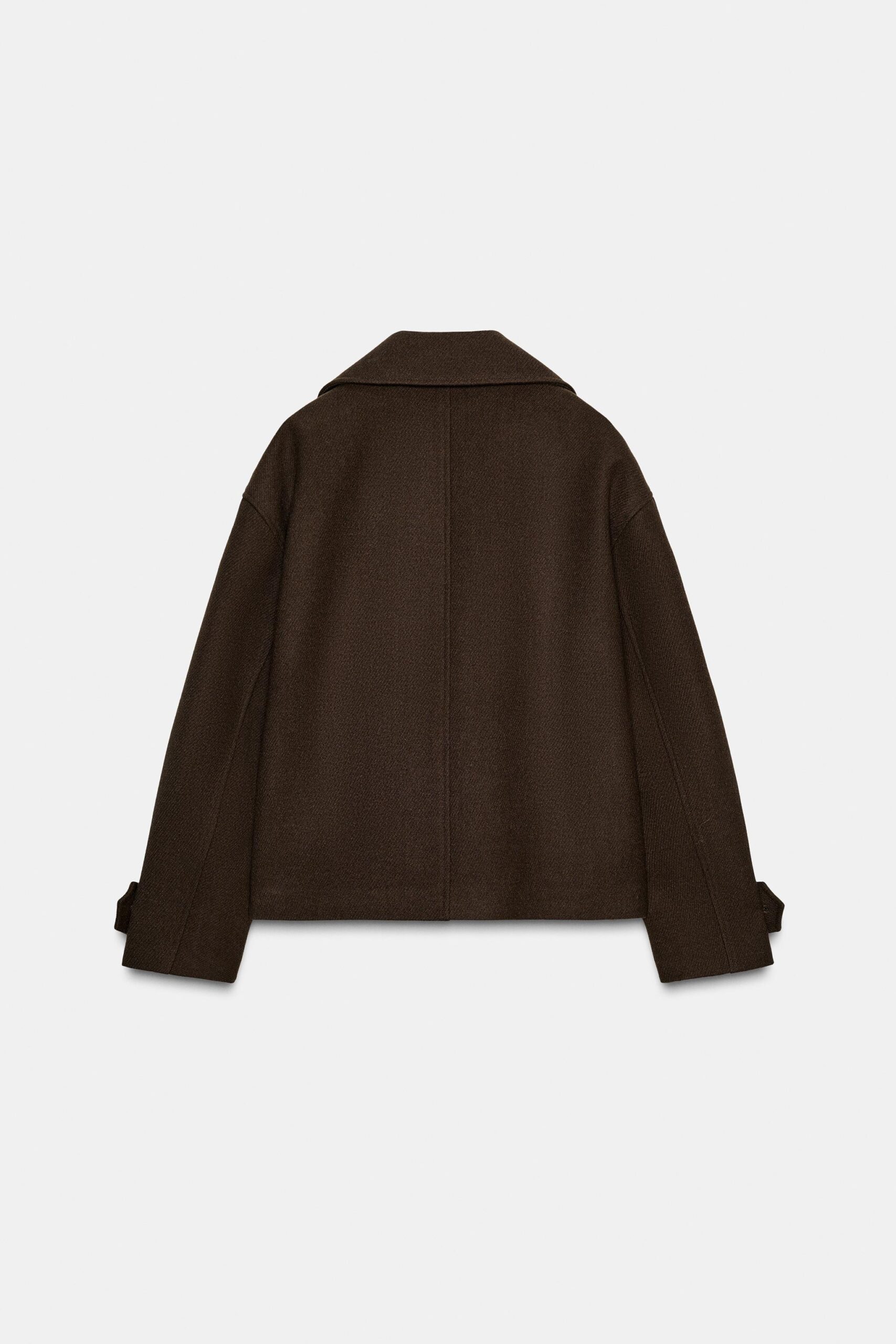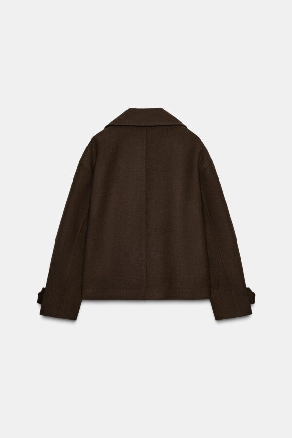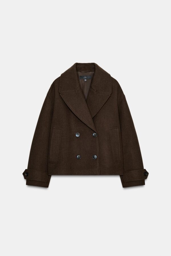 Short coat with a lapel collar and long sleeves with tab and button detail. Featuring front welt pockets and a double-breasted button fastening.