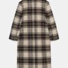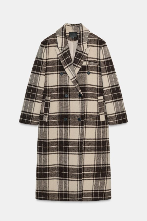 Coat made from wool yarn. Featuring a notched lapel collar and long sleeves. False front welt pockets. Inner lining. Double-breasted front button fastening.