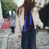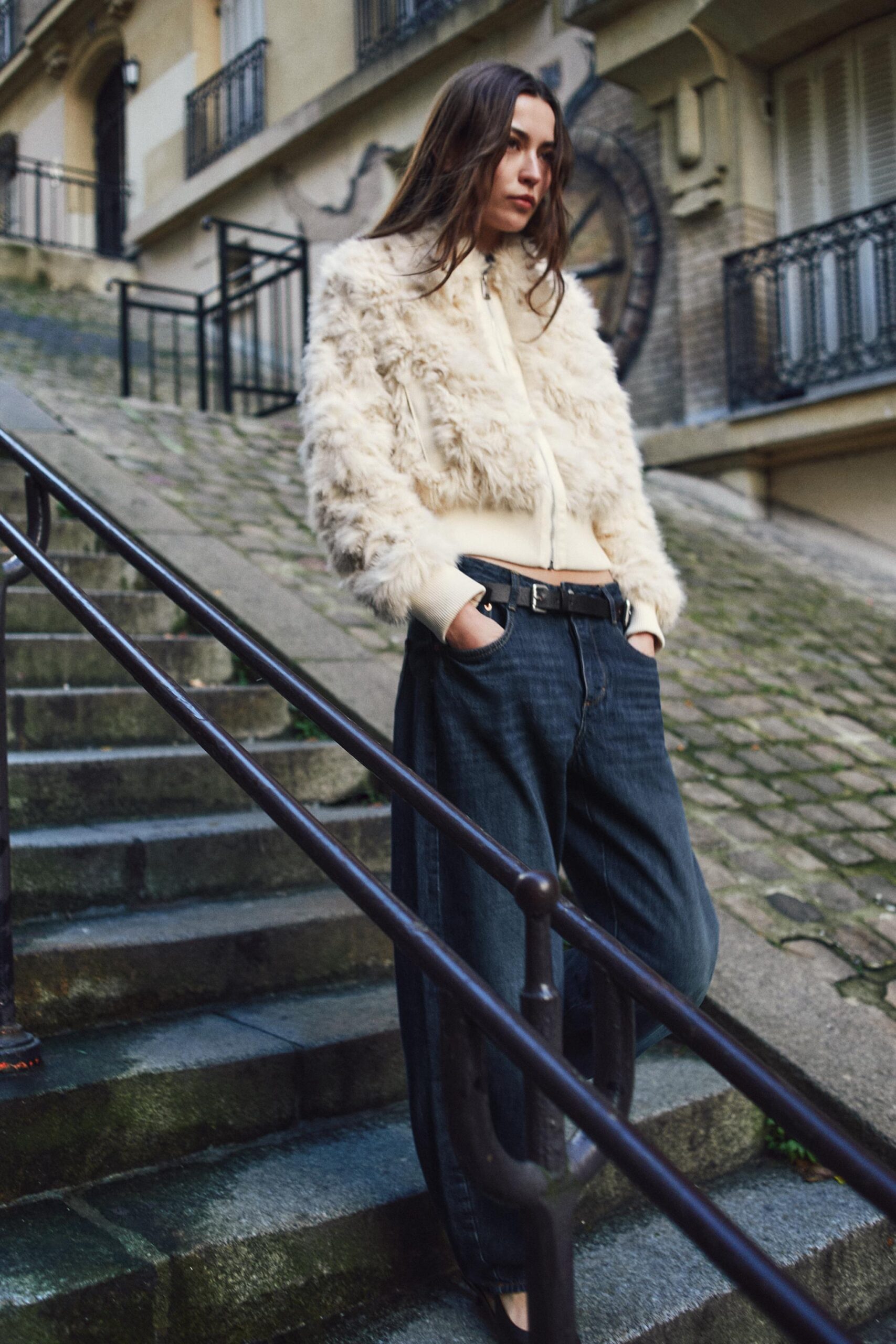 Jacket with a lapel collar and long sleeves with cuffs. Front welt pockets. Front zip fastening.
