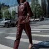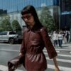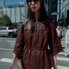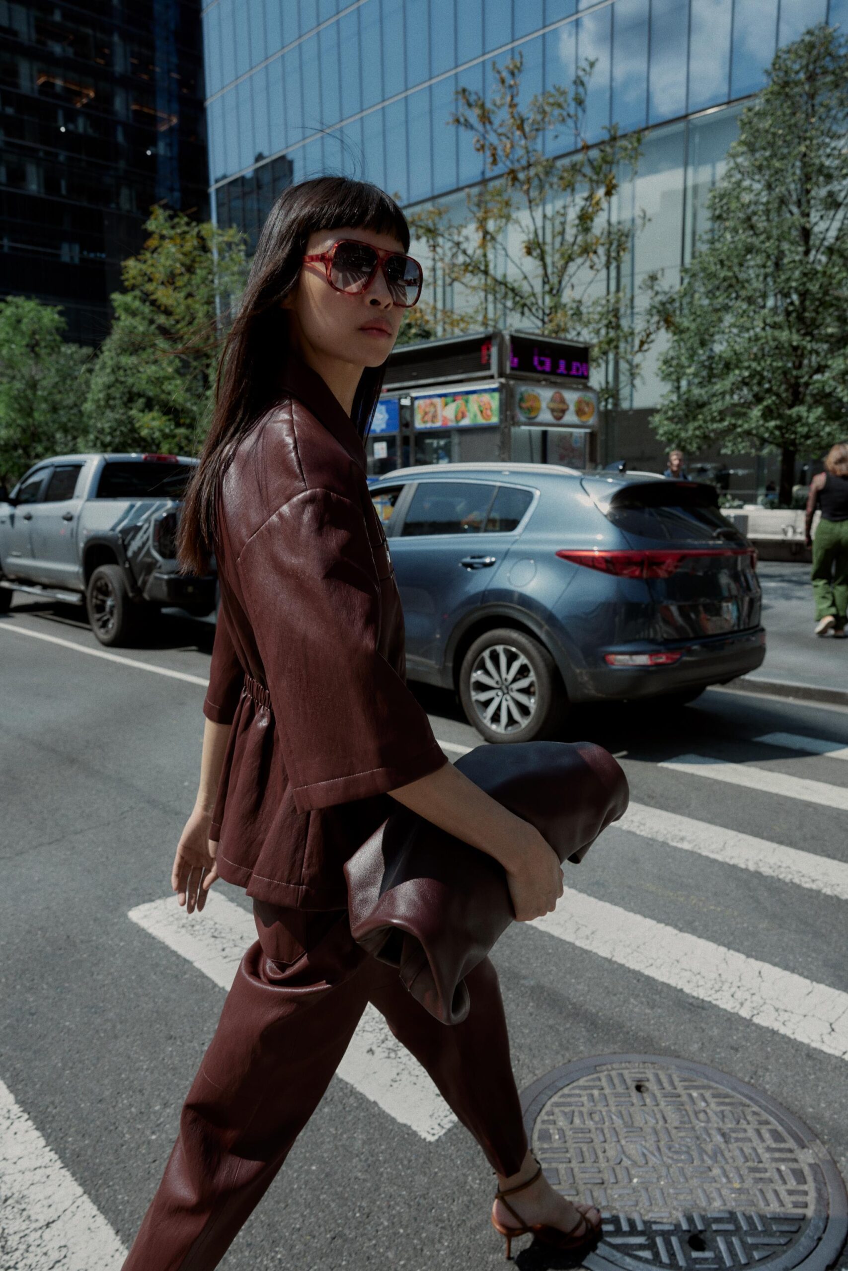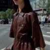 Jacket with a lapel collar and sleeves below the elbow. Featuring an elasticated waist. Faux front welt pockets. Zip-up front.