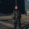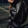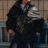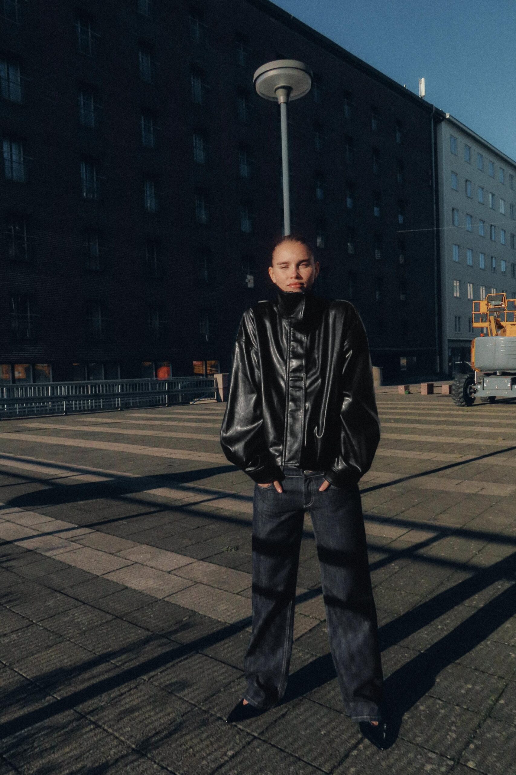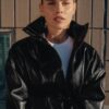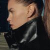 High collar, long sleeve jacket with elasticated cuffs. Side pockets. Lined. Elasticated hem. Zip-up front with a placket concealing snap-button fastenings.
