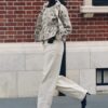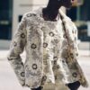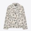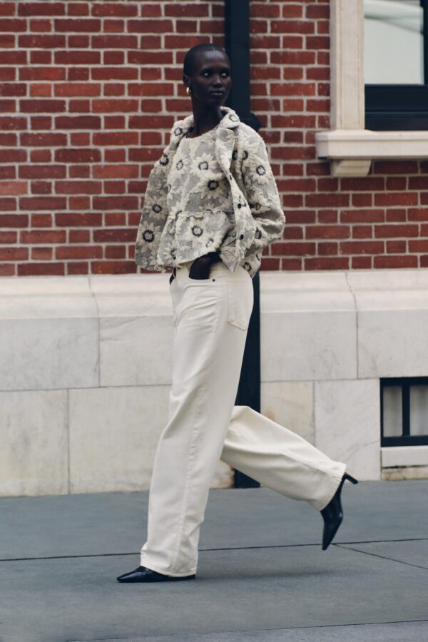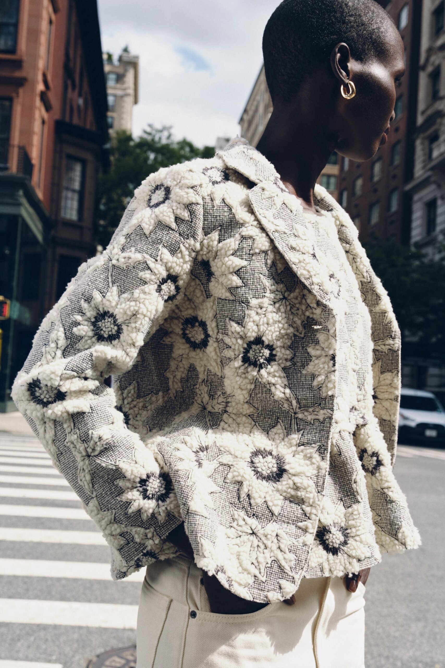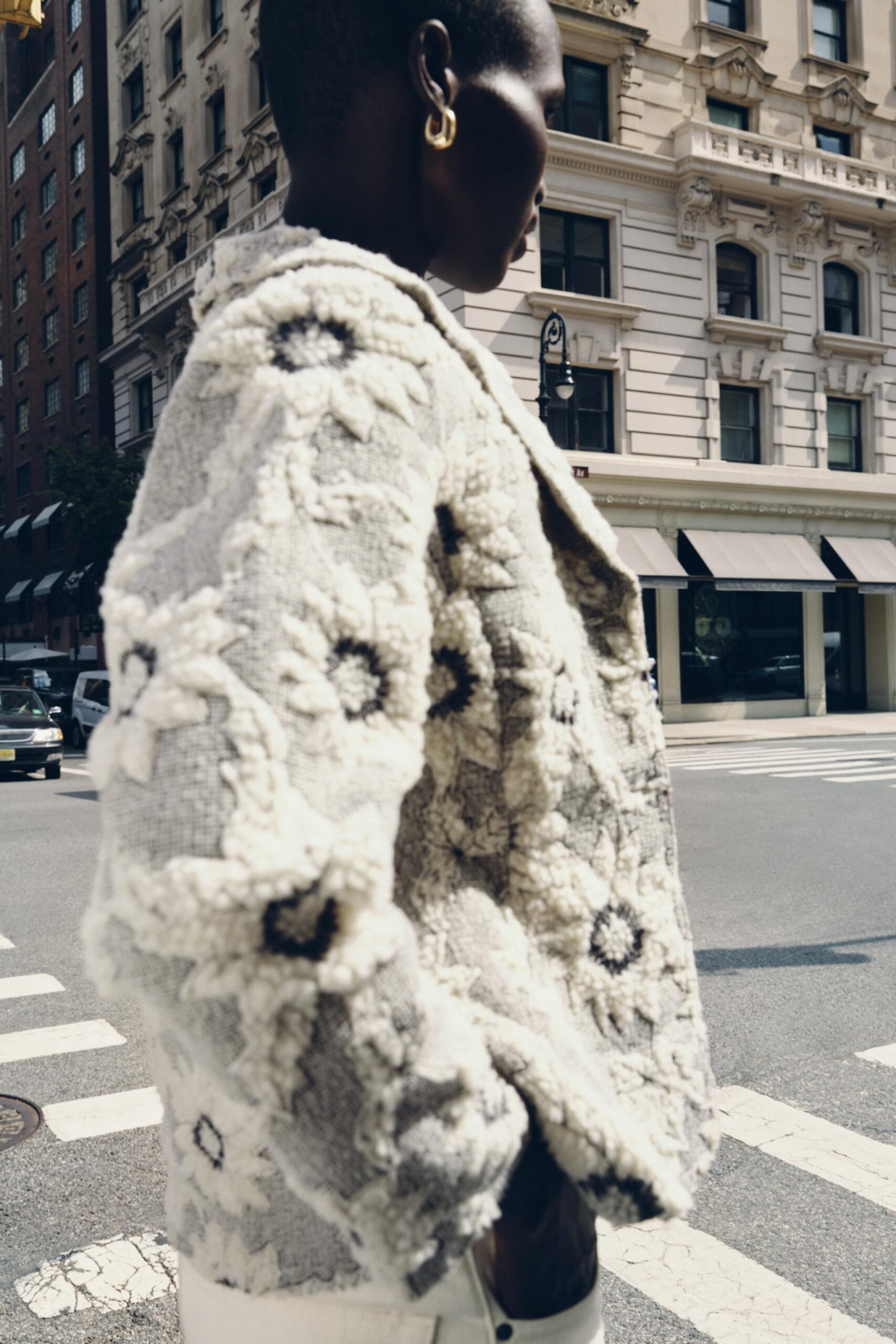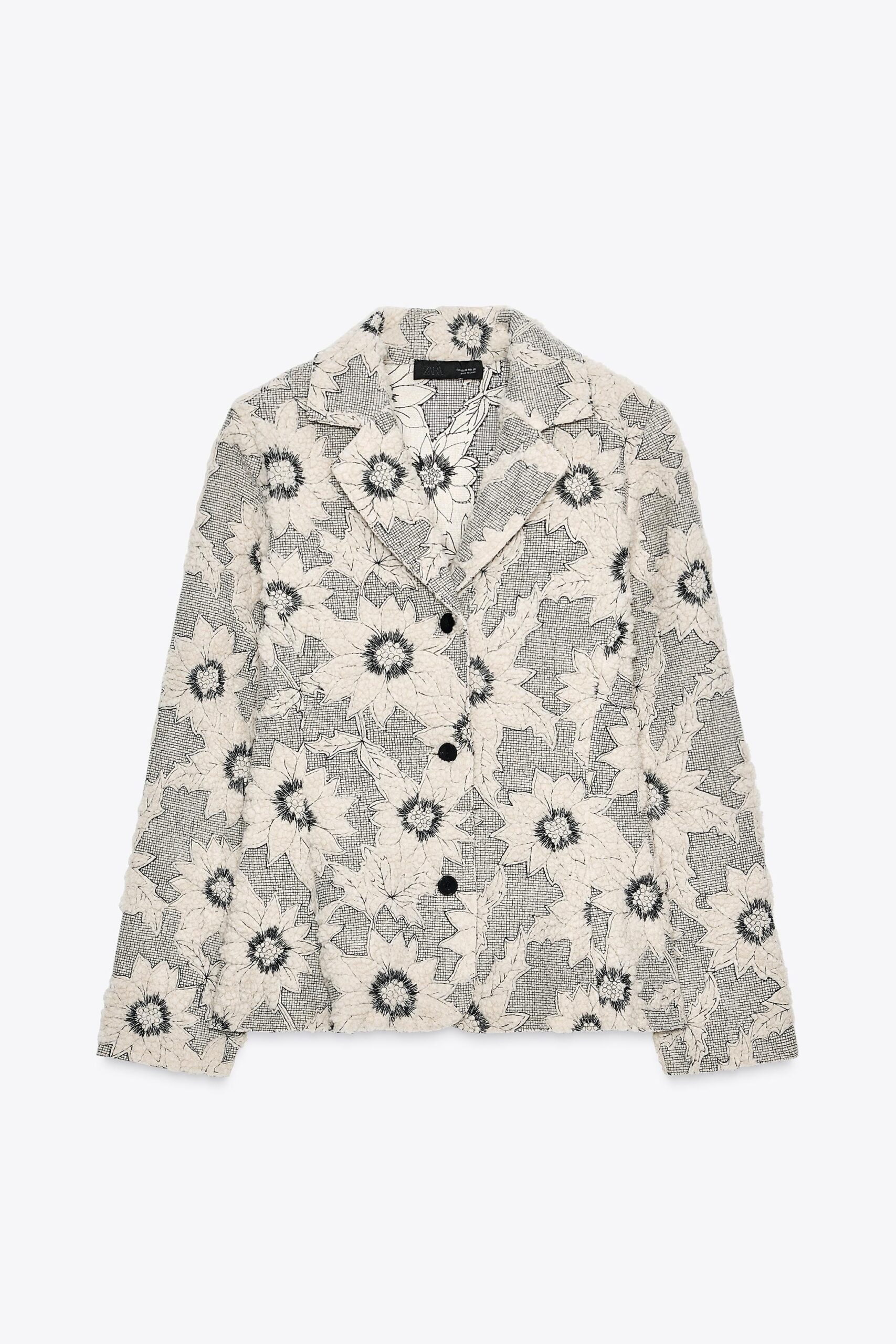 Blazer made in textured fabric. Featuring a lapel collar and long sleeves. Contrasting embroidered floral detail. Front button fastening.