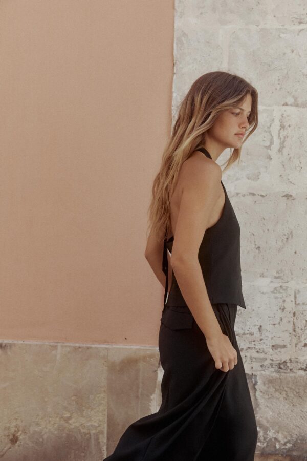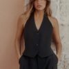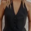 Halter neck waistcoat top with adjustable tie and V-neck. Front button fastening.