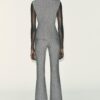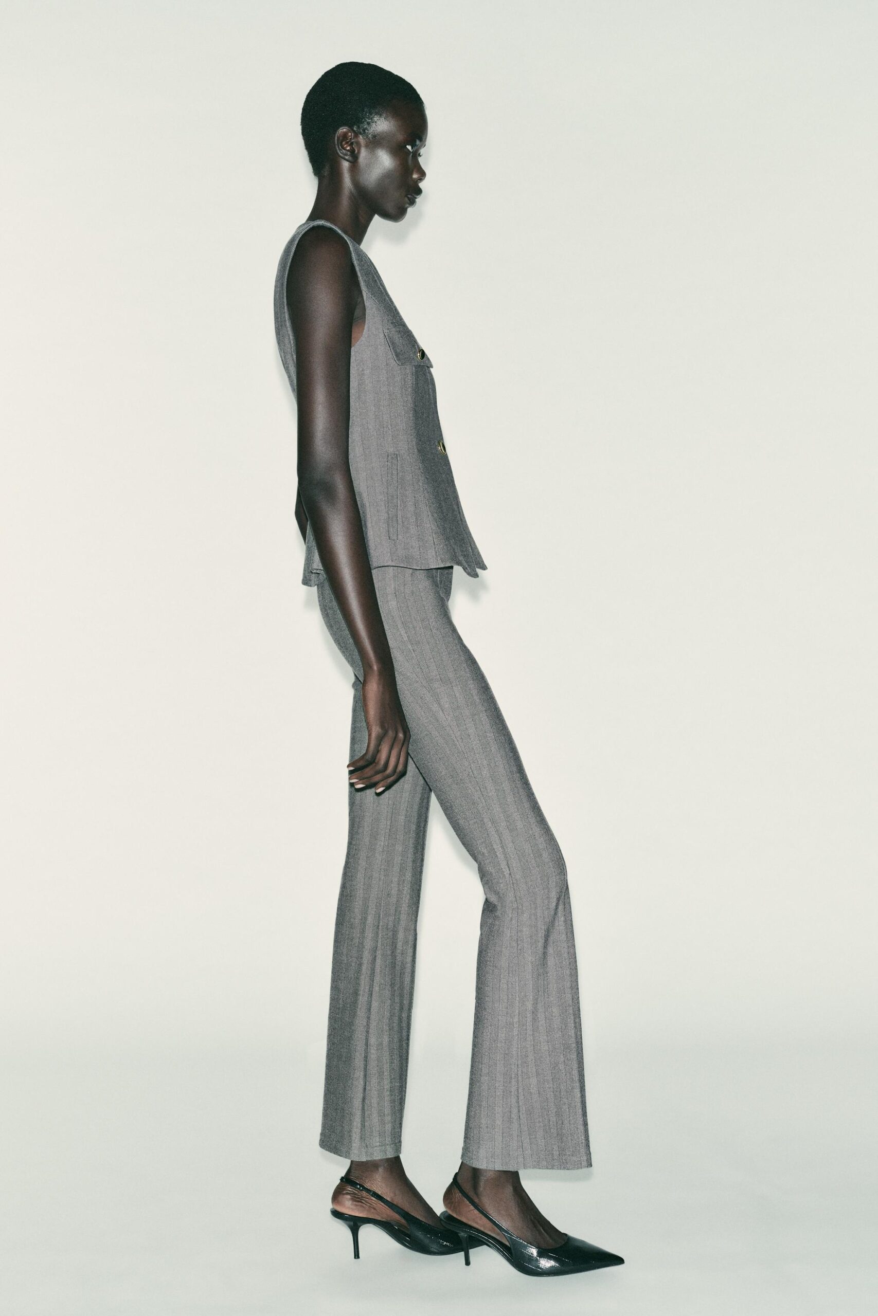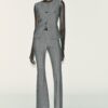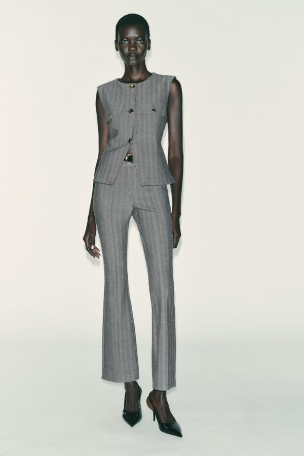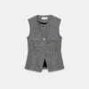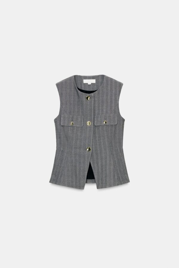 Round neck waistcoat with sleeveless design. Featuring front flap details with false buttons and front welt pockets. Flared hem. Front button fastening.