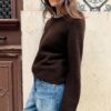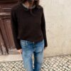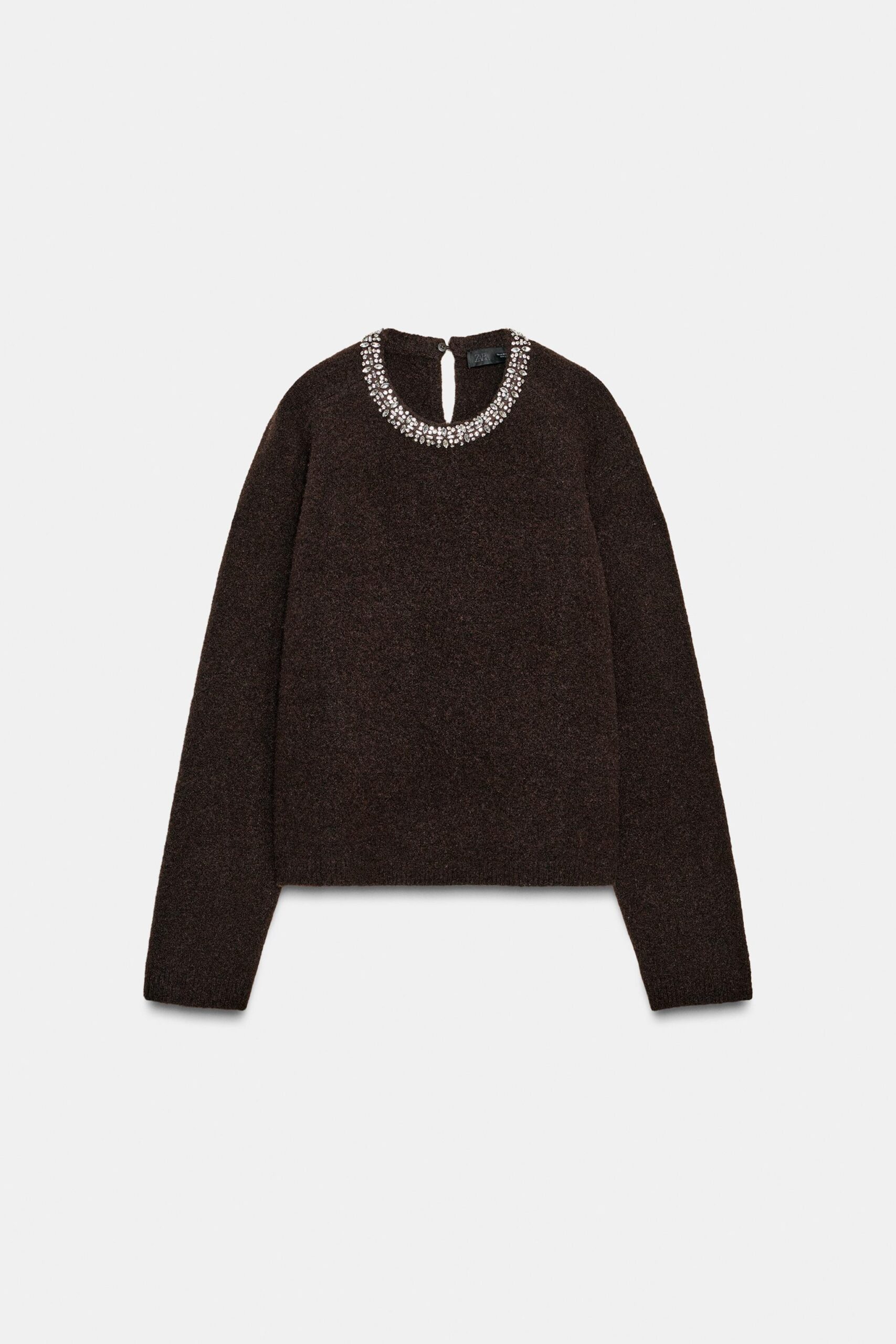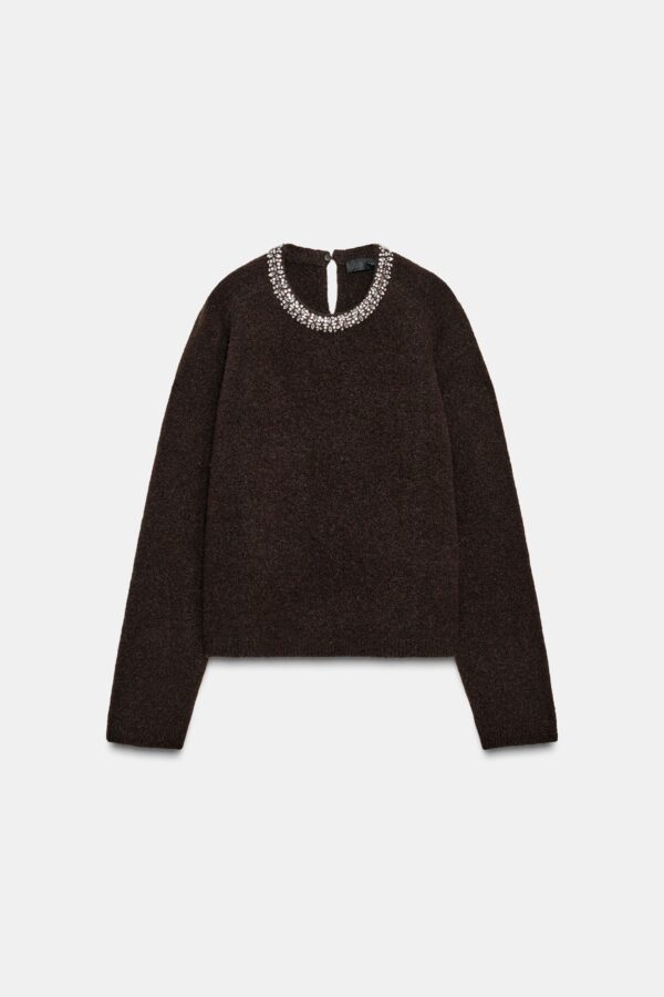 Plain knit jumper made with 30% wool. Round neck with jewel beads. Button and opening fastening at the back.