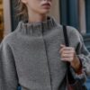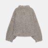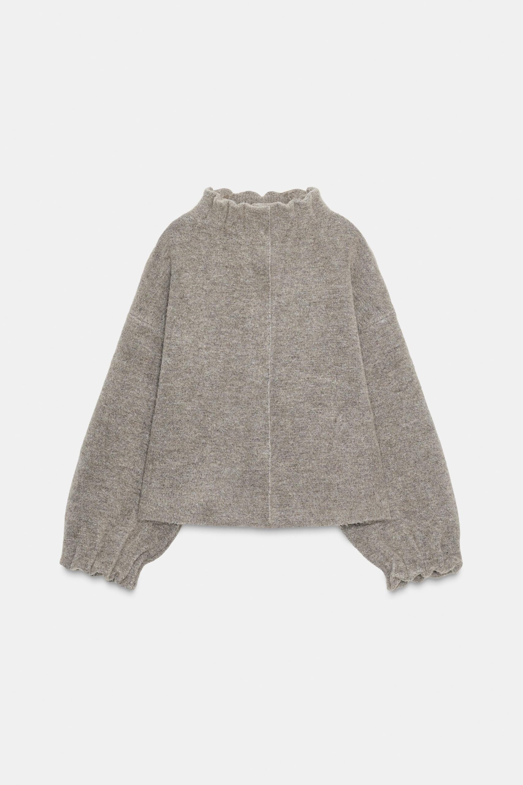 Bomber-style jacket with a high neck and long sleeves. Featuring elasticated ruffled trims and a front fastening with concealed snap buttons.