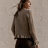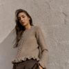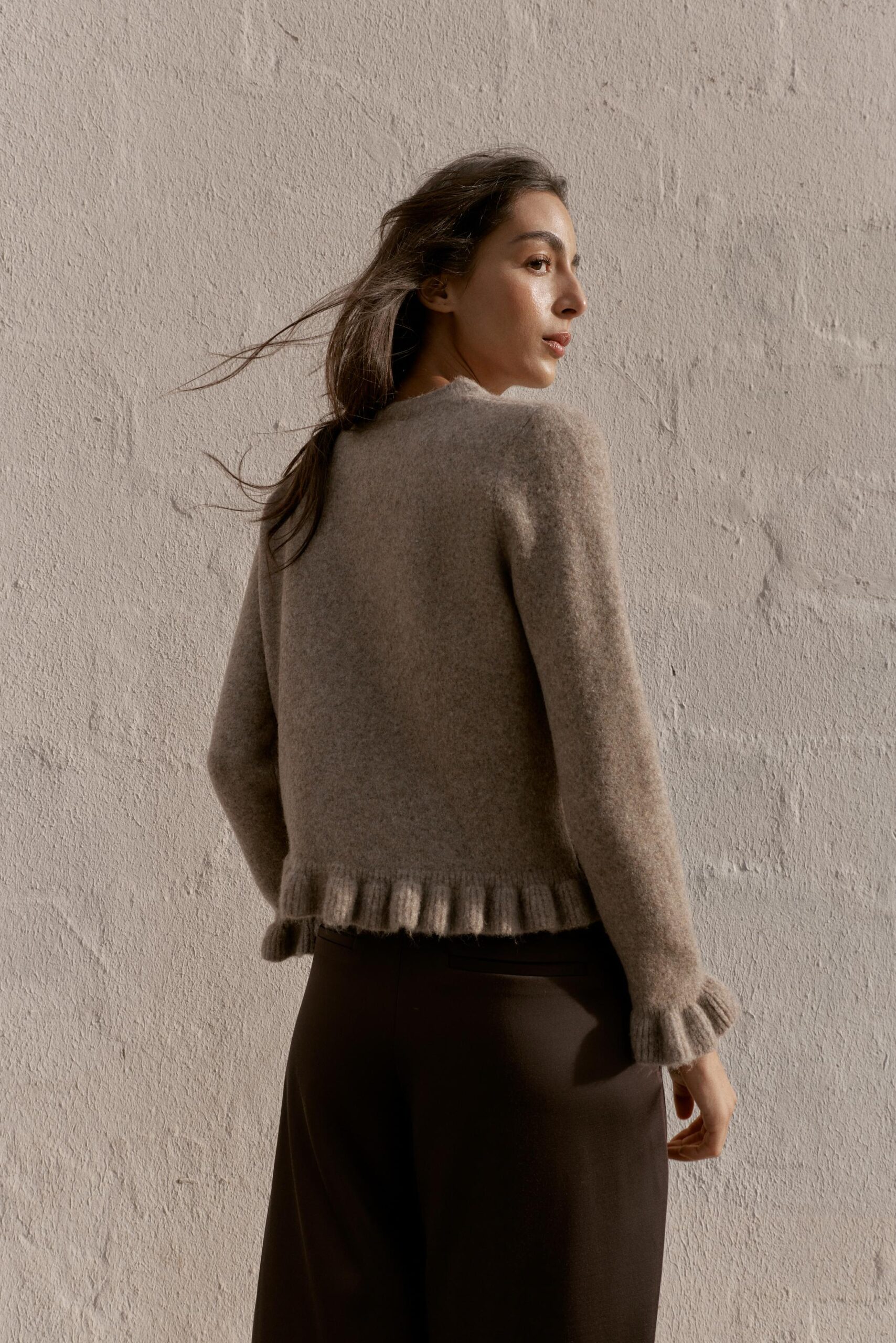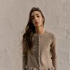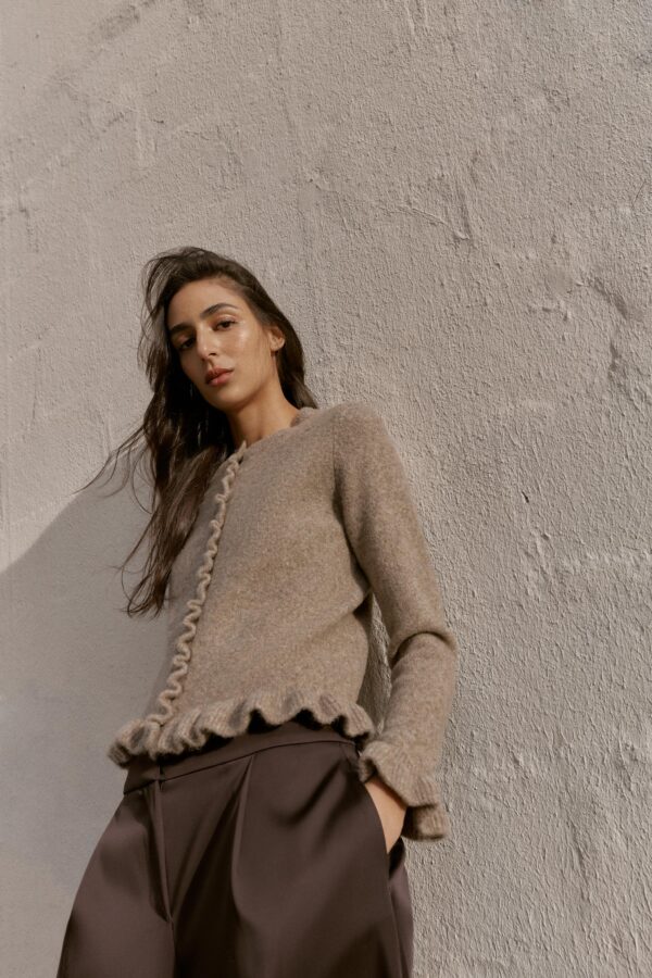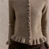 Plain knit cardigan with a round neck and long sleeves. Featuring ruffle trim details. Front button fastening.
