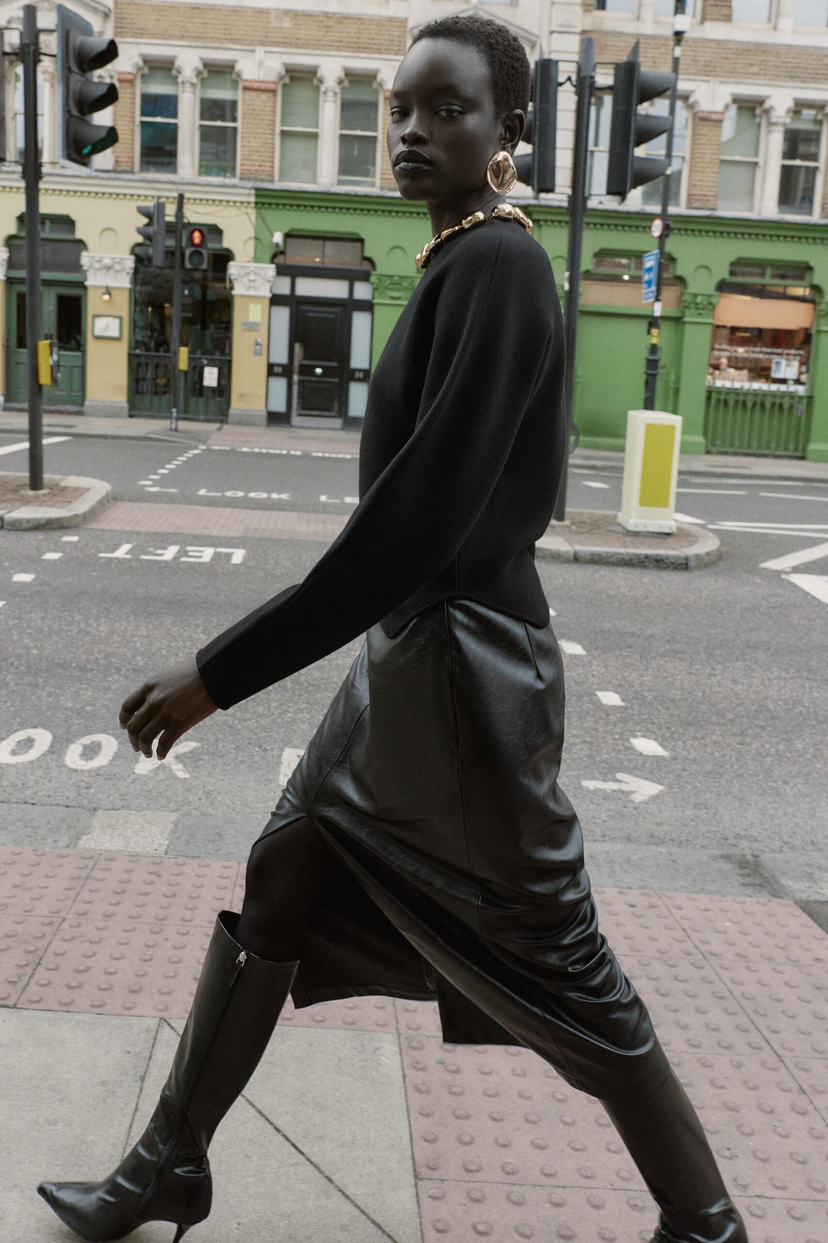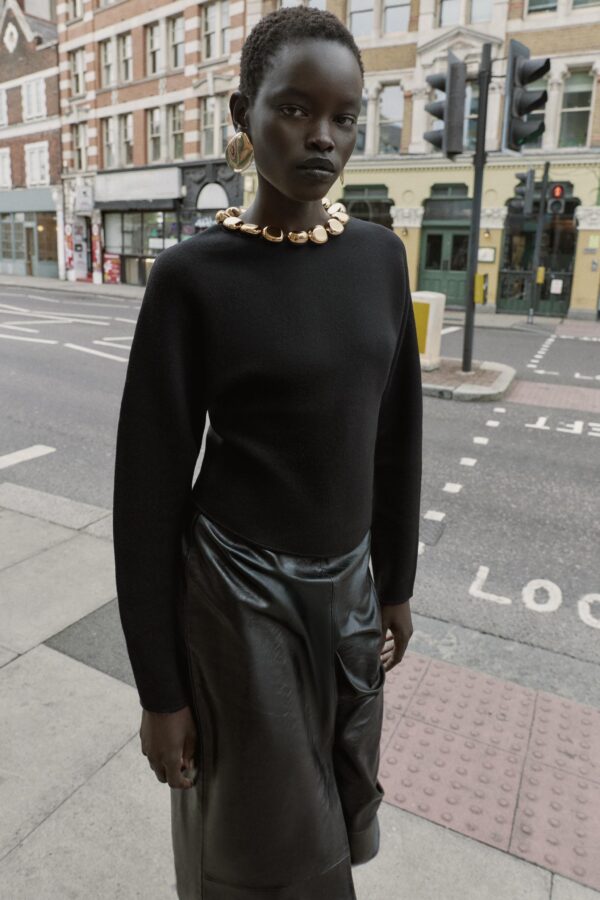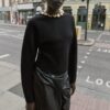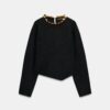 Round neck jumper with metallic bead appliqués and long sleeves. Asymmetrical hem. Fastens at the back with an opening and button.