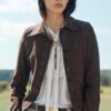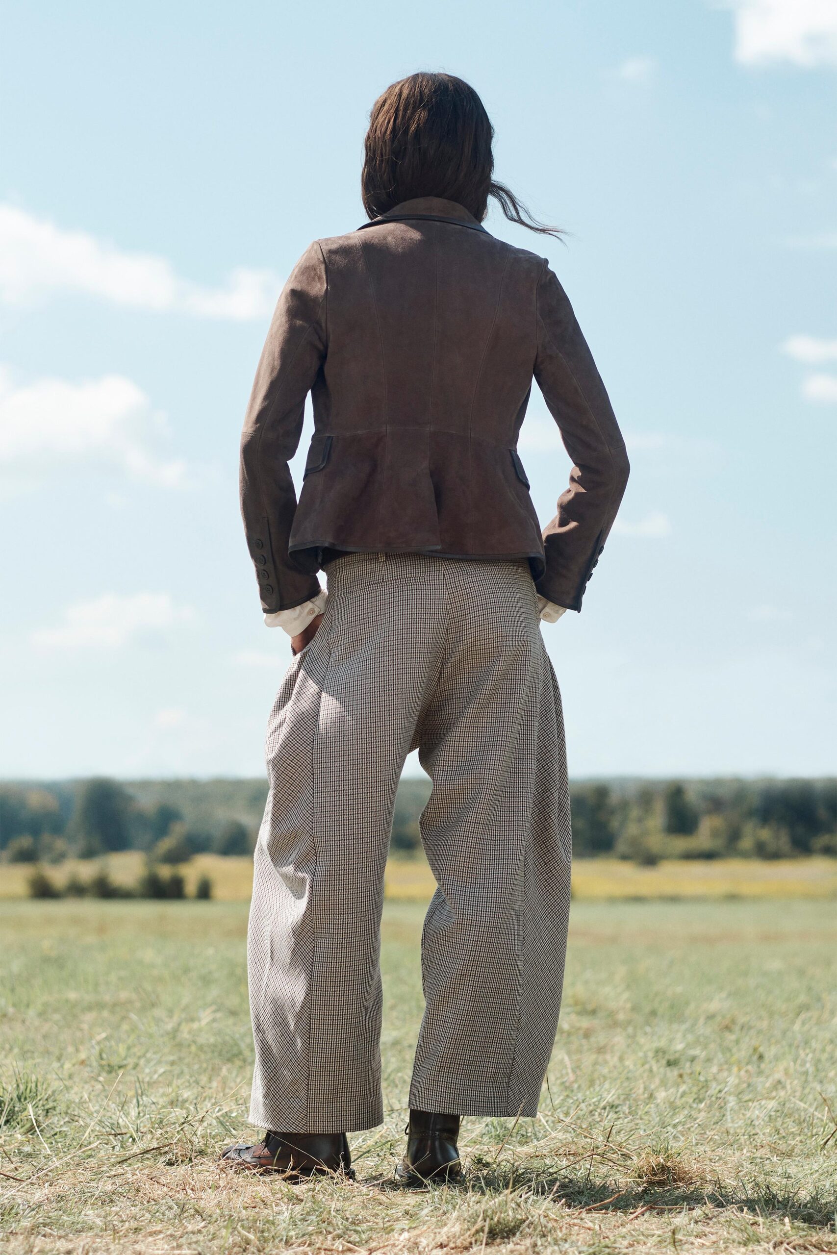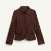 Tailored blazer with 100% suede leather main fabric. Lapel collar and long sleeves with vents and buttons. Front flap pockets. Tone-on-tone piping. Front button fastening.