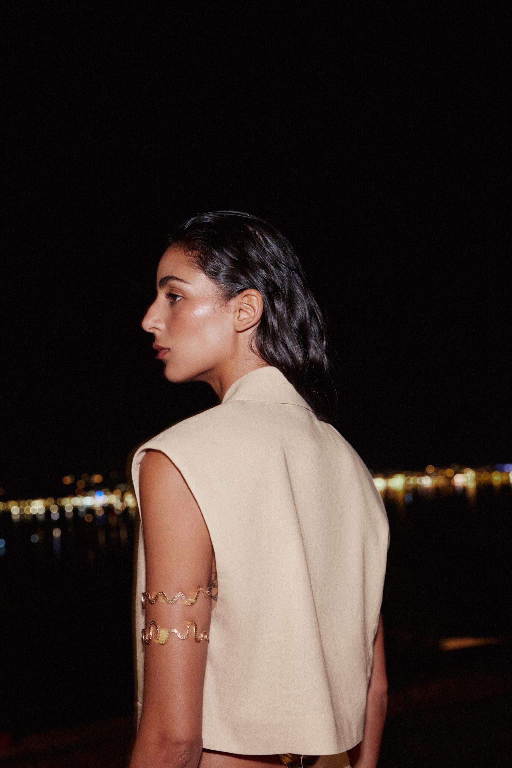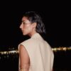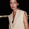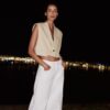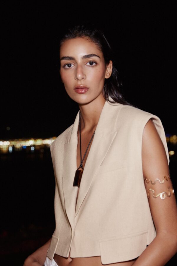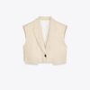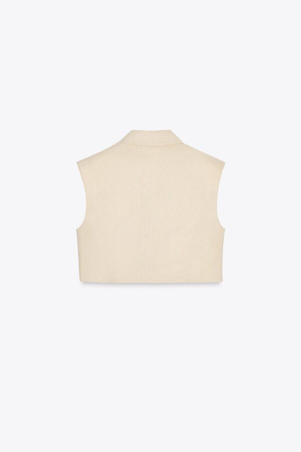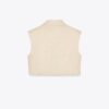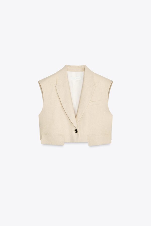 Lapel collar waistcoat with pronounced shoulders and sleeveless design. Featuring front flap detail and a single-button fastening at the front.