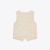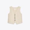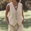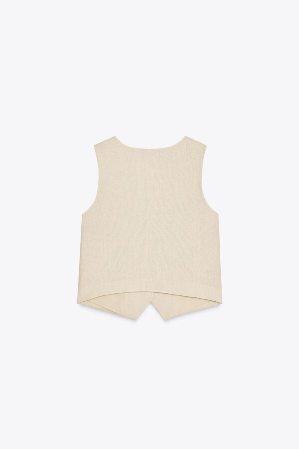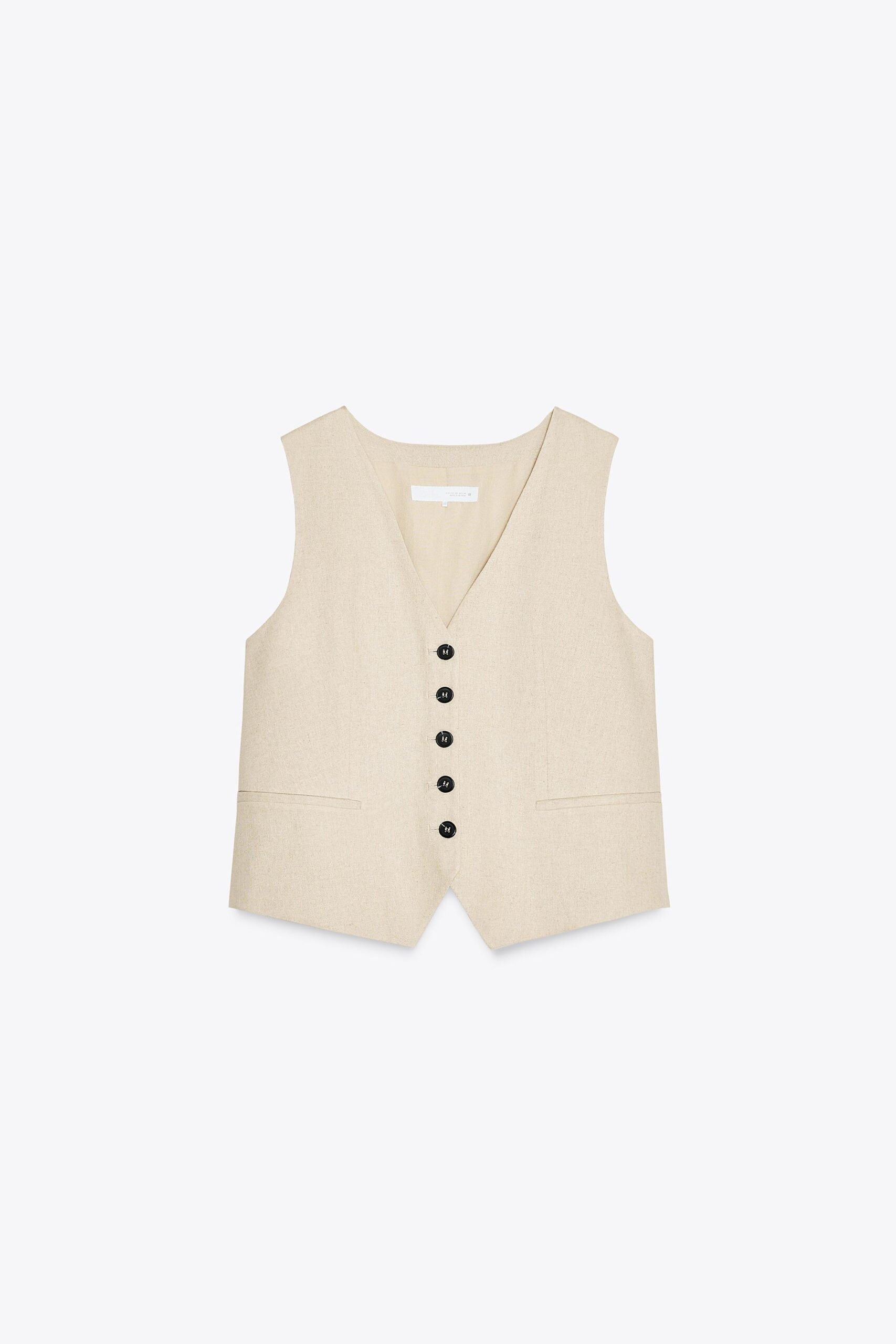 Waistcoat made with linen. Featuring a V-neck and sleeveless design. False front welt pockets. Front button fastening.