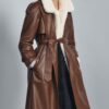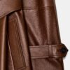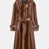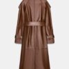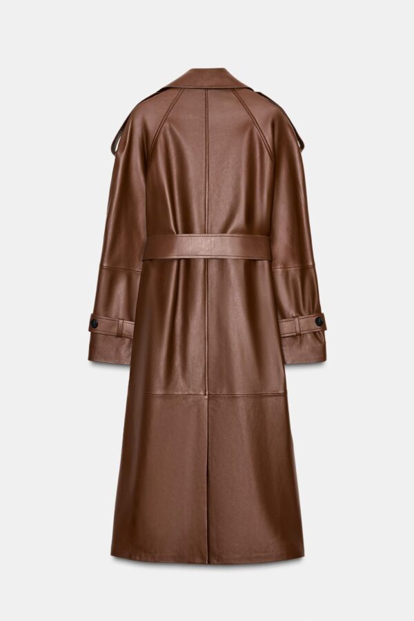 Long trench coat with main fabric made of 100% leather. Notched lapel collar and long sleeve adjustable with tabs and a button. Front pockets. Belt in the same fabric adjustable with ties. Interior lining. Hem finished with a back vent.