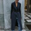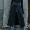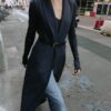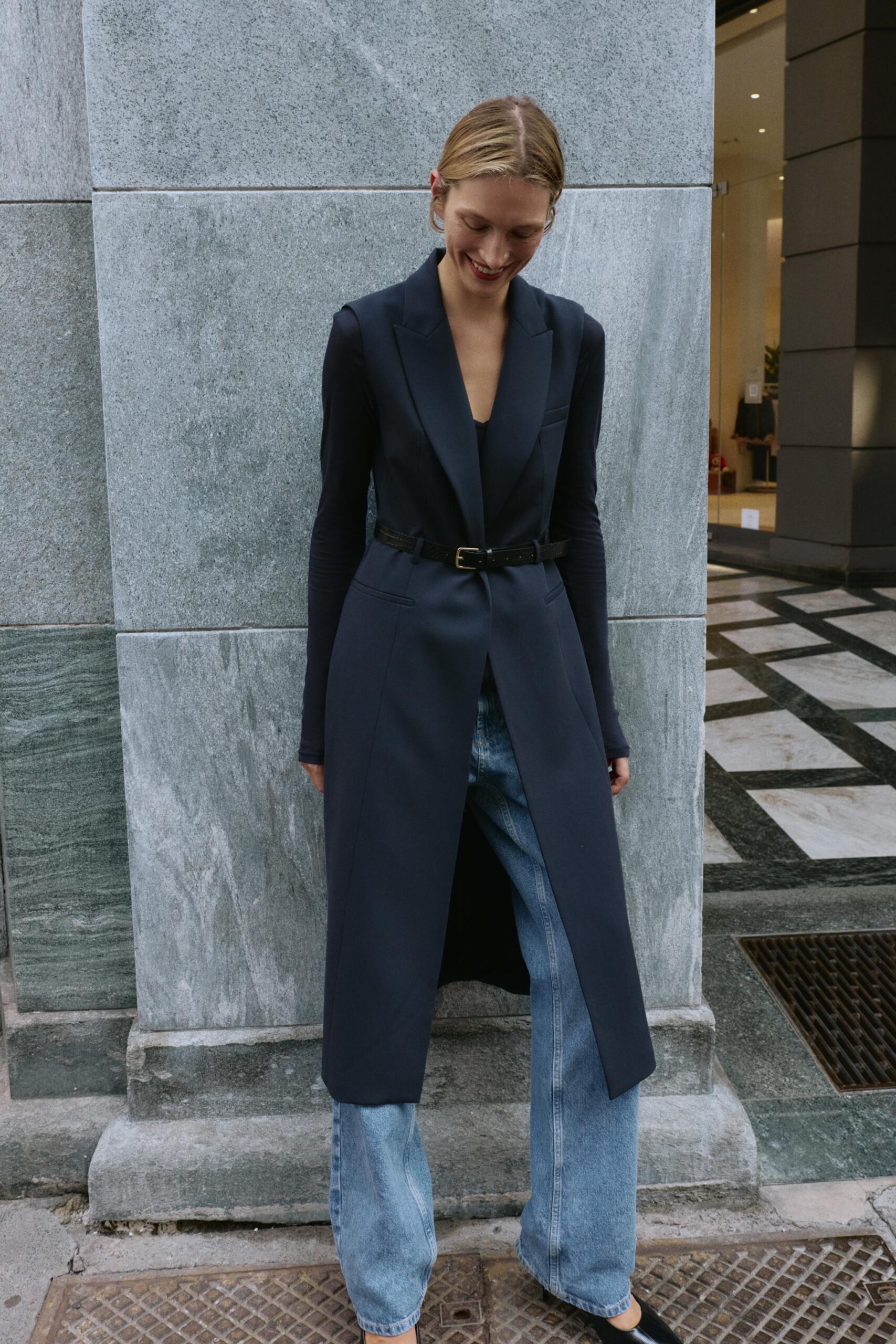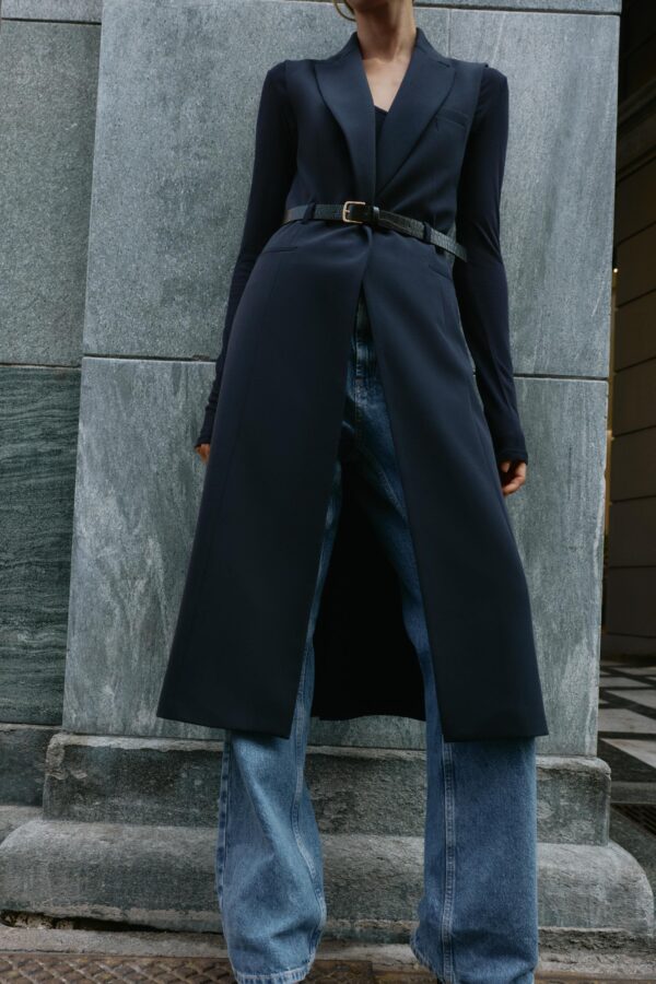 Waistcoat with a lapel collar and sleeveless design. Featuring front welt pockets, a vent at the back, a concealed snap-button fastening on the front and a belt.