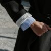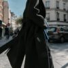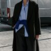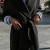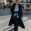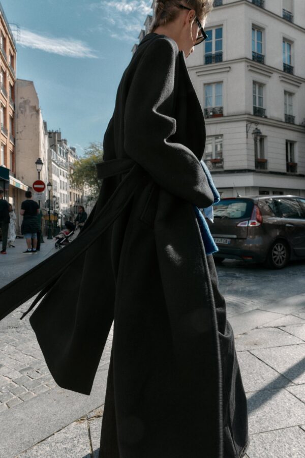Wool coat with a lapel collar and long sleeves with shoulder pads. Features front welt pockets and a back vent at the hem. Double-breasted front button fastening and a belt in the same fabric.