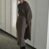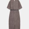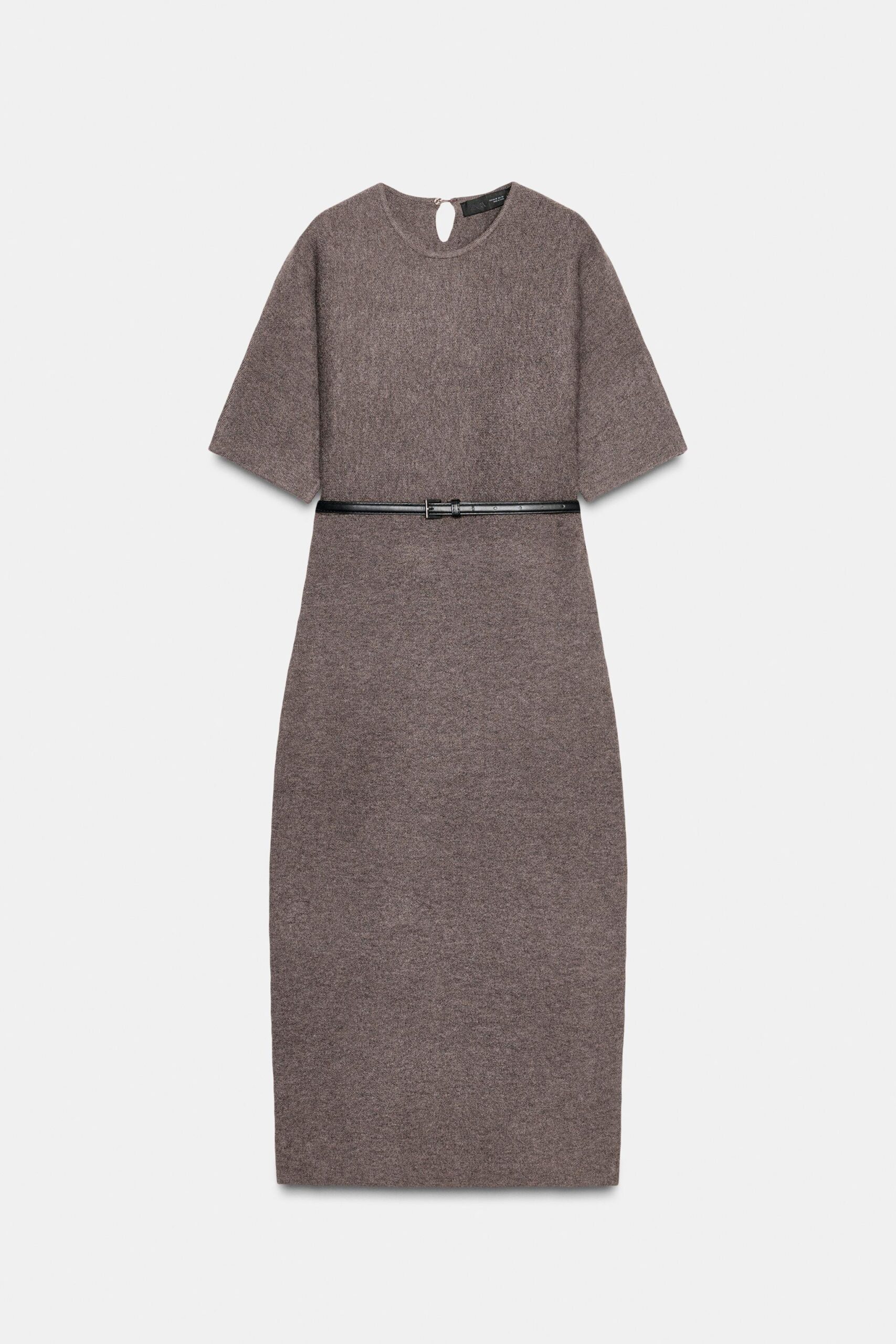 Ready-to-wear knitted dress with a round neck and short sleeves. Features a thin belt. Fastens at the back with an opening and button.