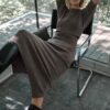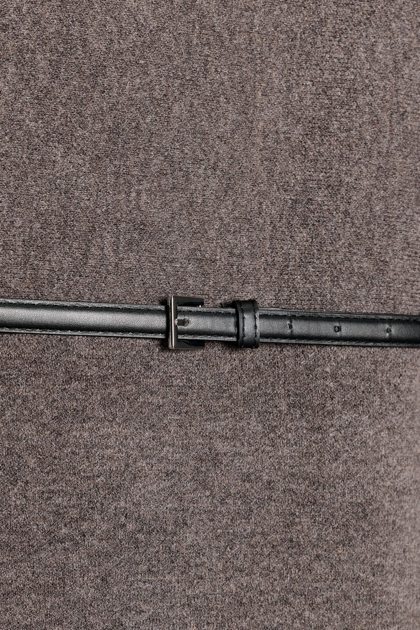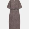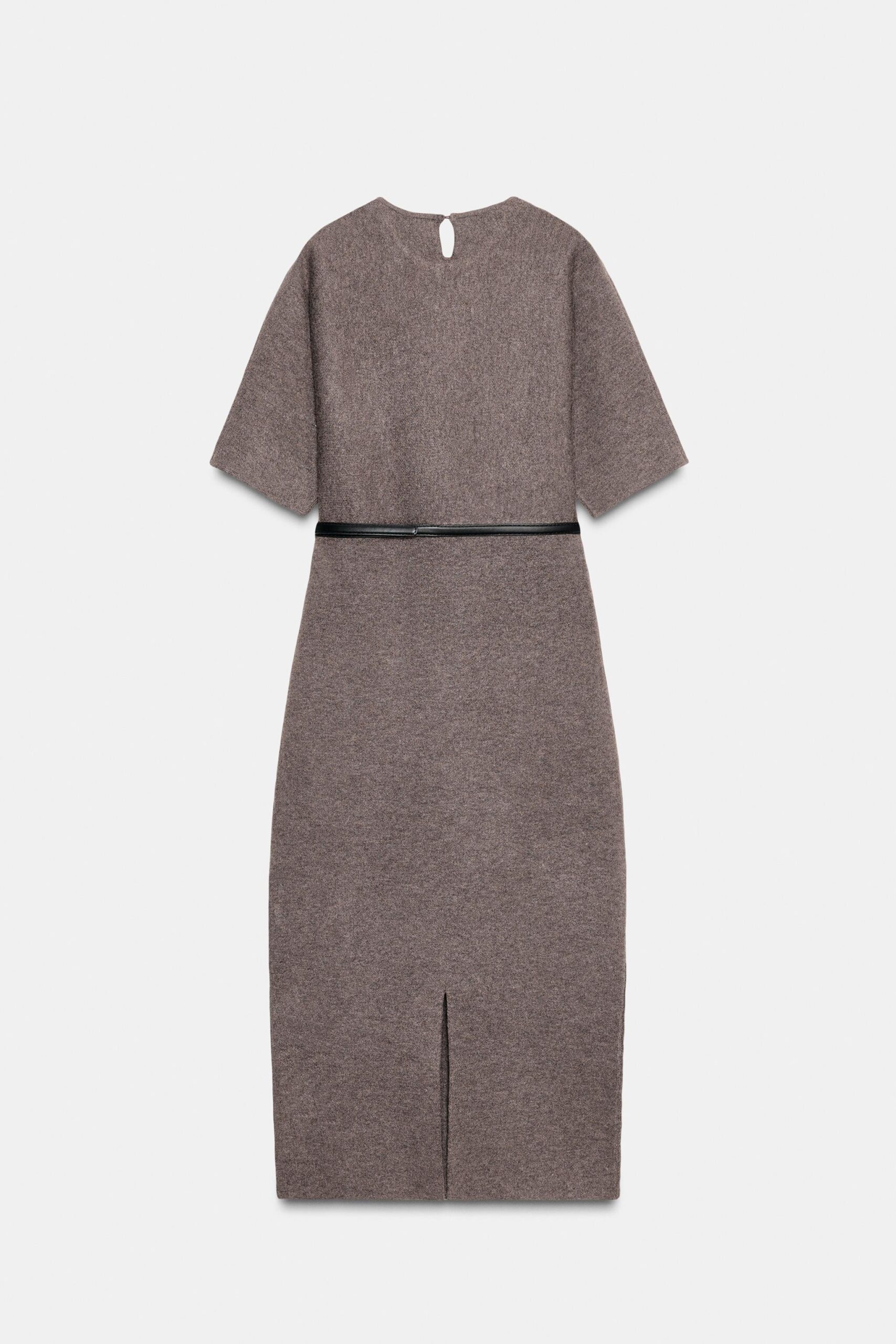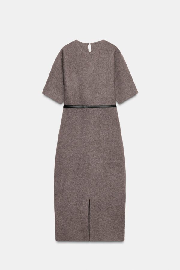 Ready-to-wear knitted dress with a round neck and short sleeves. Features a thin belt. Fastens at the back with an opening and button.