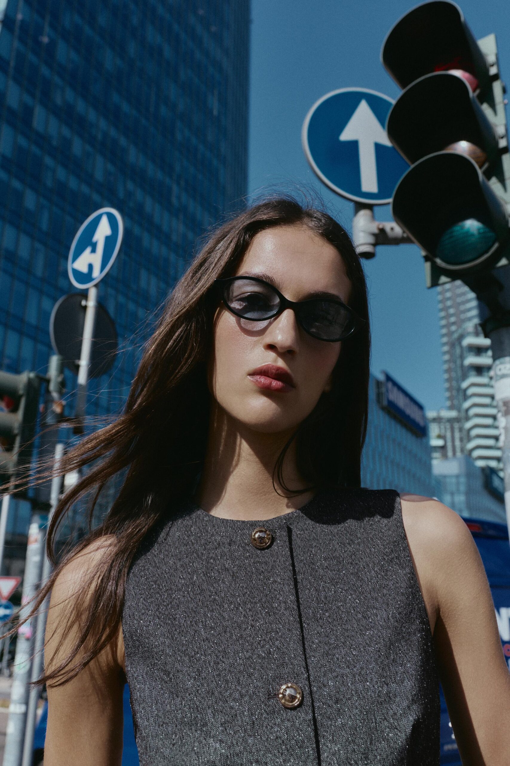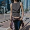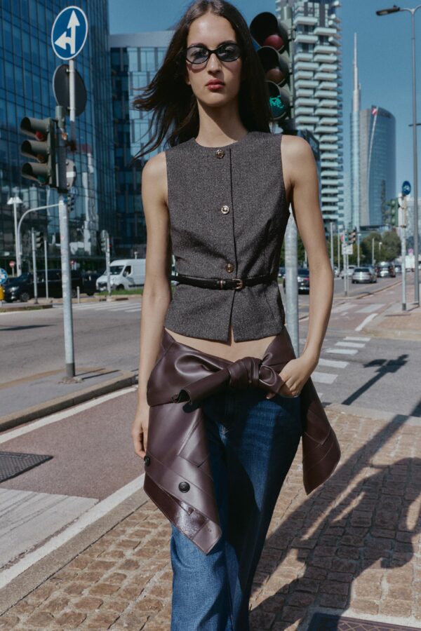 Round neck waistcoat with sleeveless design. Featuring a thin belt. Front button fastening.