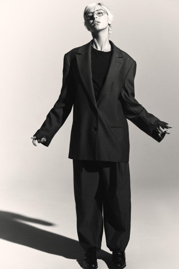 Oversize blazer with a notched lapel collar and long sleeves. Featuring front welt pockets, a contrasting interior lining and multi-position button fastening on the front.