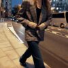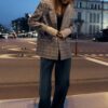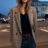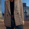 Loose-fitting blazer with a lapel collar and long sleeves with shoulder pads. Featuring front welt pockets. Back vent at the hem. Double-breasted front button fastening.