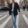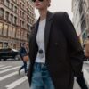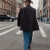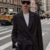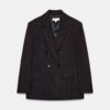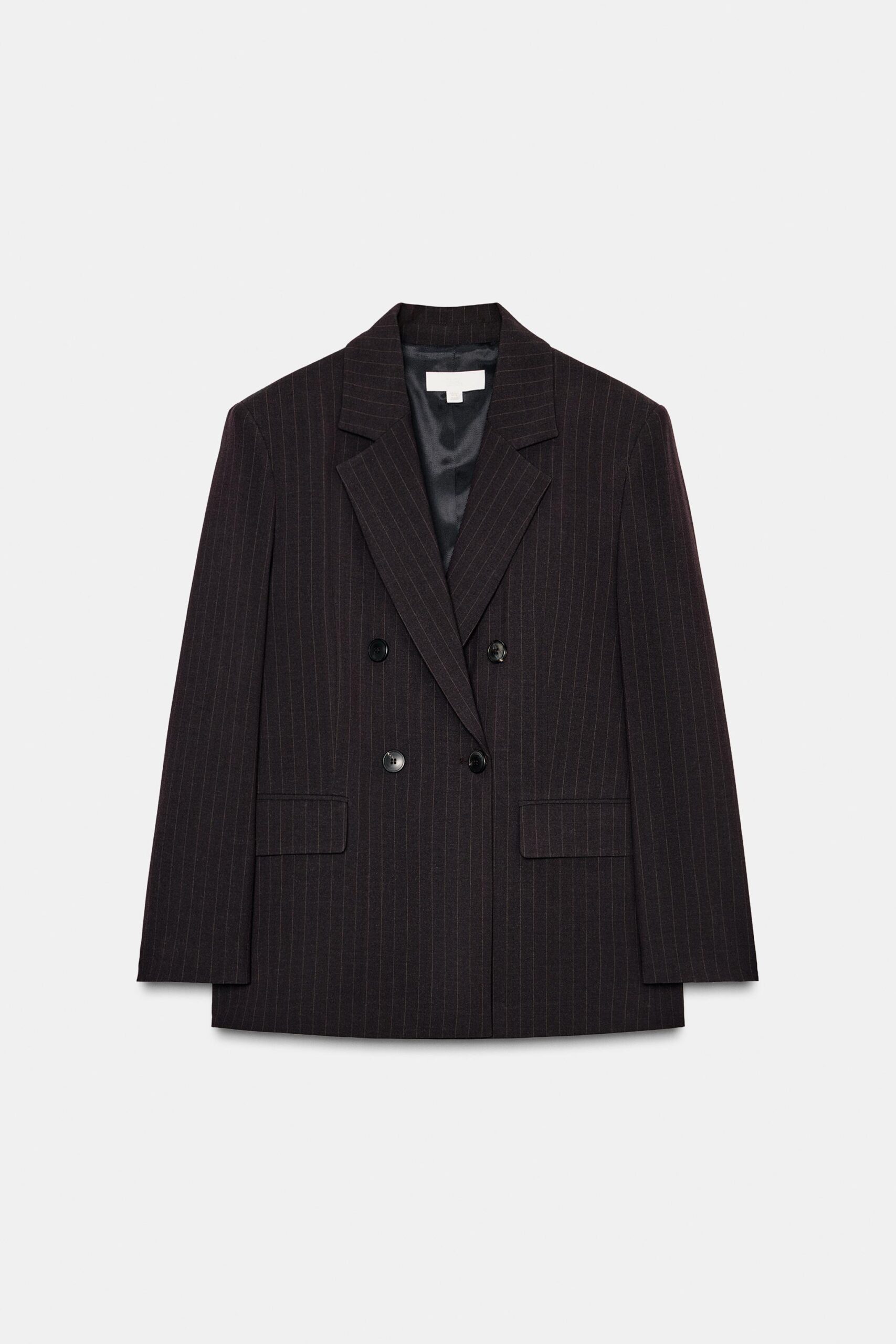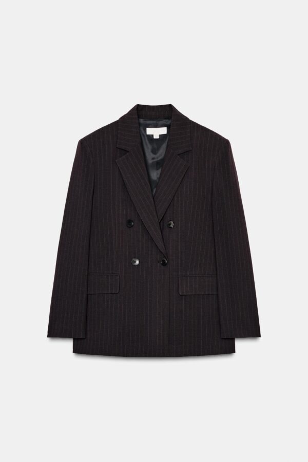 Loose-fitting blazer with a lapel collar, long sleeves, and shoulder pads. Featuring front flap pockets, a back vent, and double-breasted button fastening.