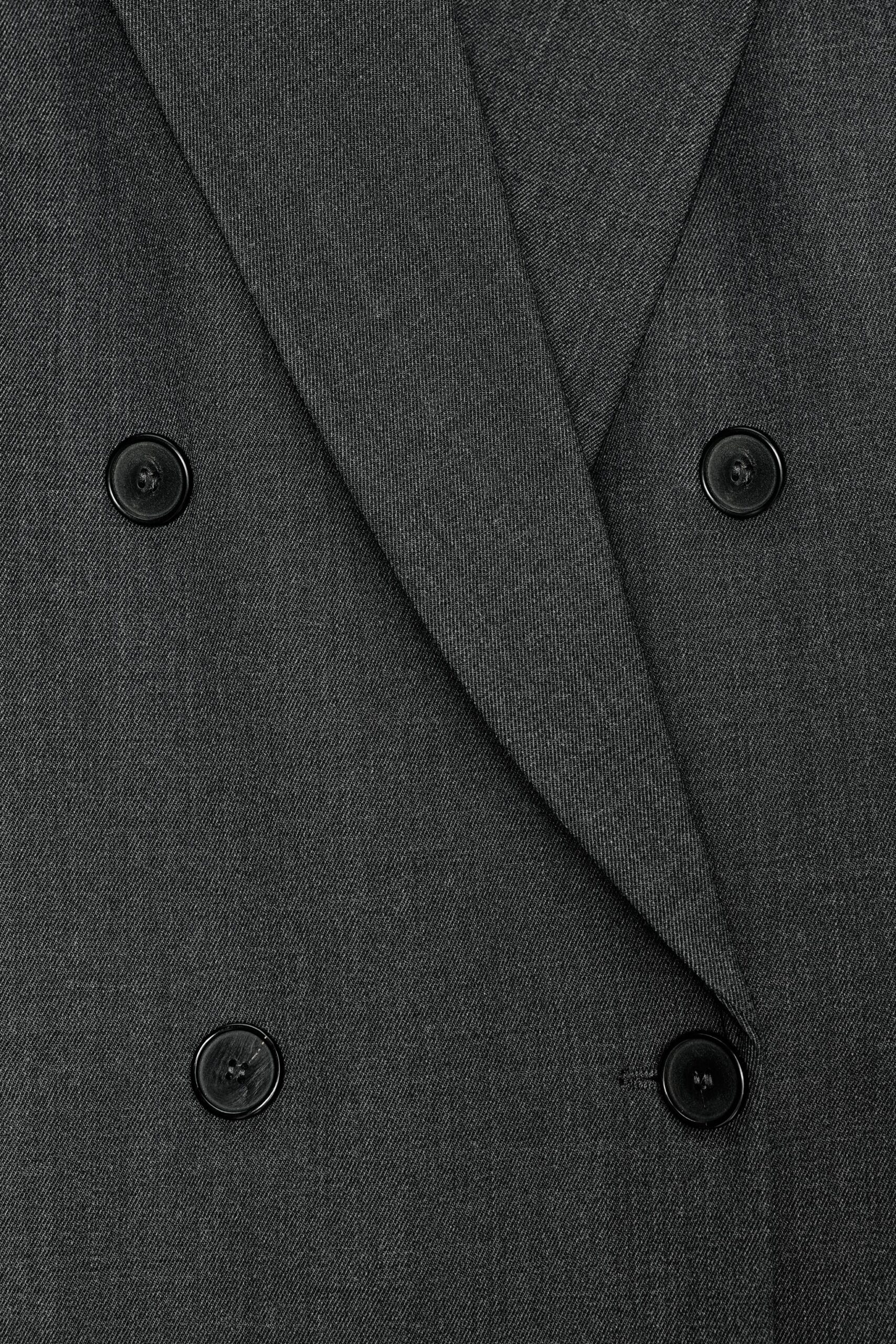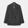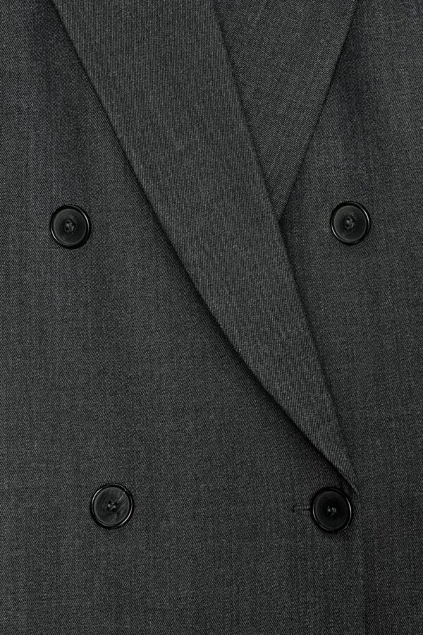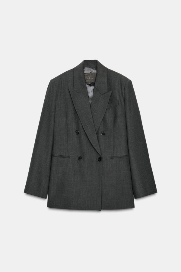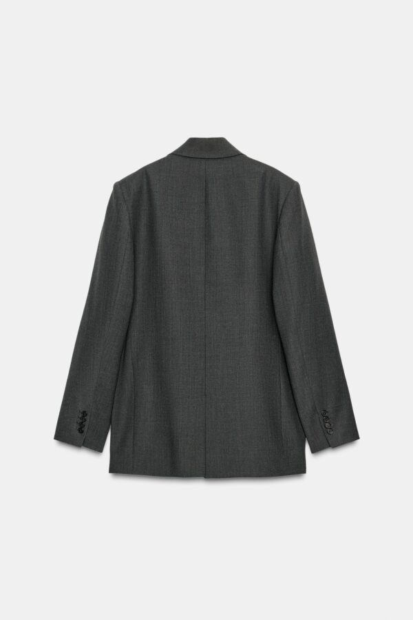 Blazer made from a wool blend yarn. Notched lapel collar and long sleeves. Front welt pockets. Interior lining. Front double-breasted button fastening.
