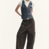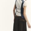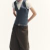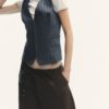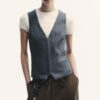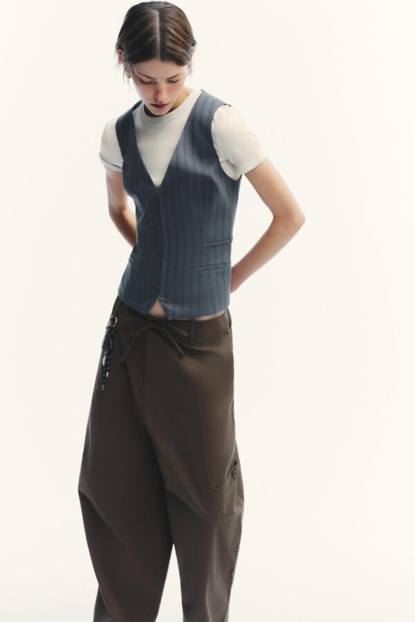 V-neck waistcoat top. Open back with adjustable straps. False front welt pockets. Metal hook-and-eye fastening at the front.