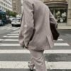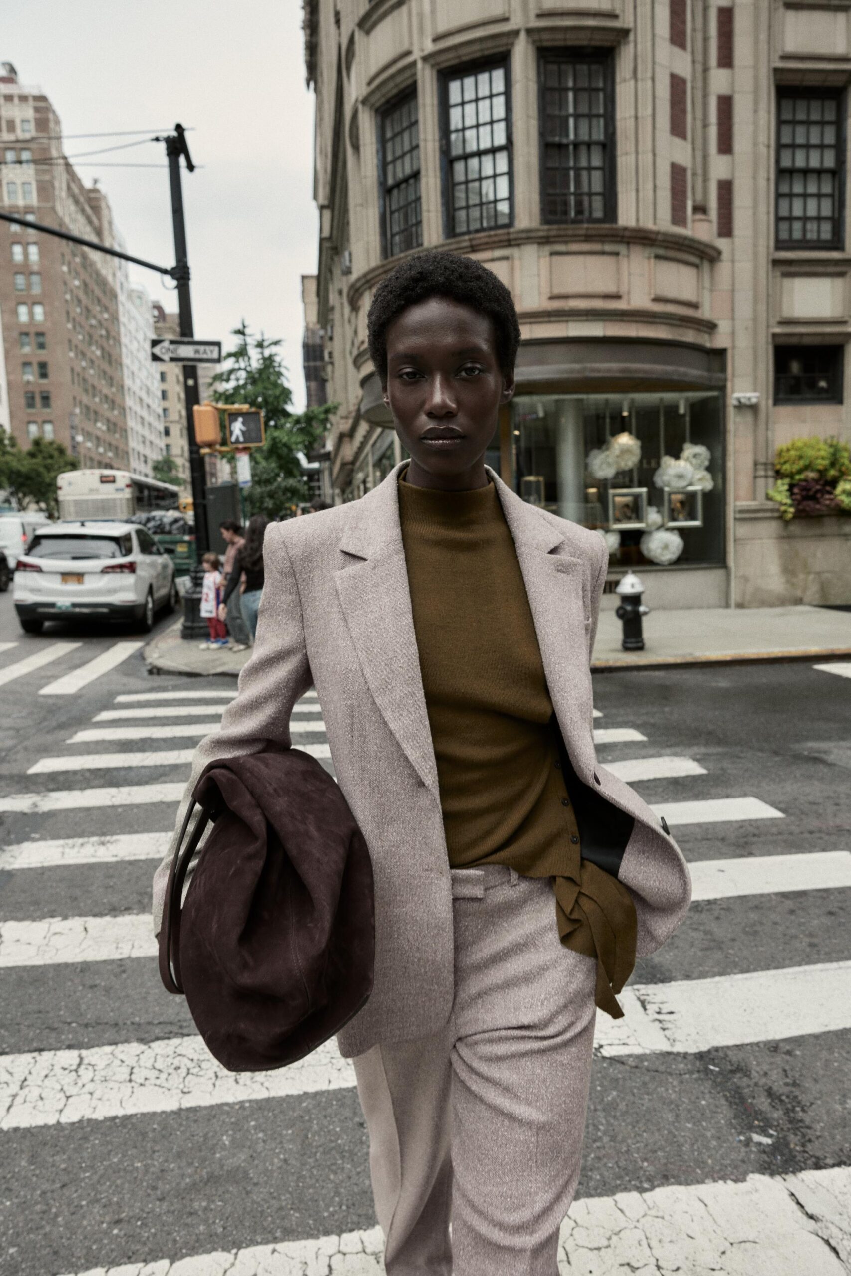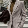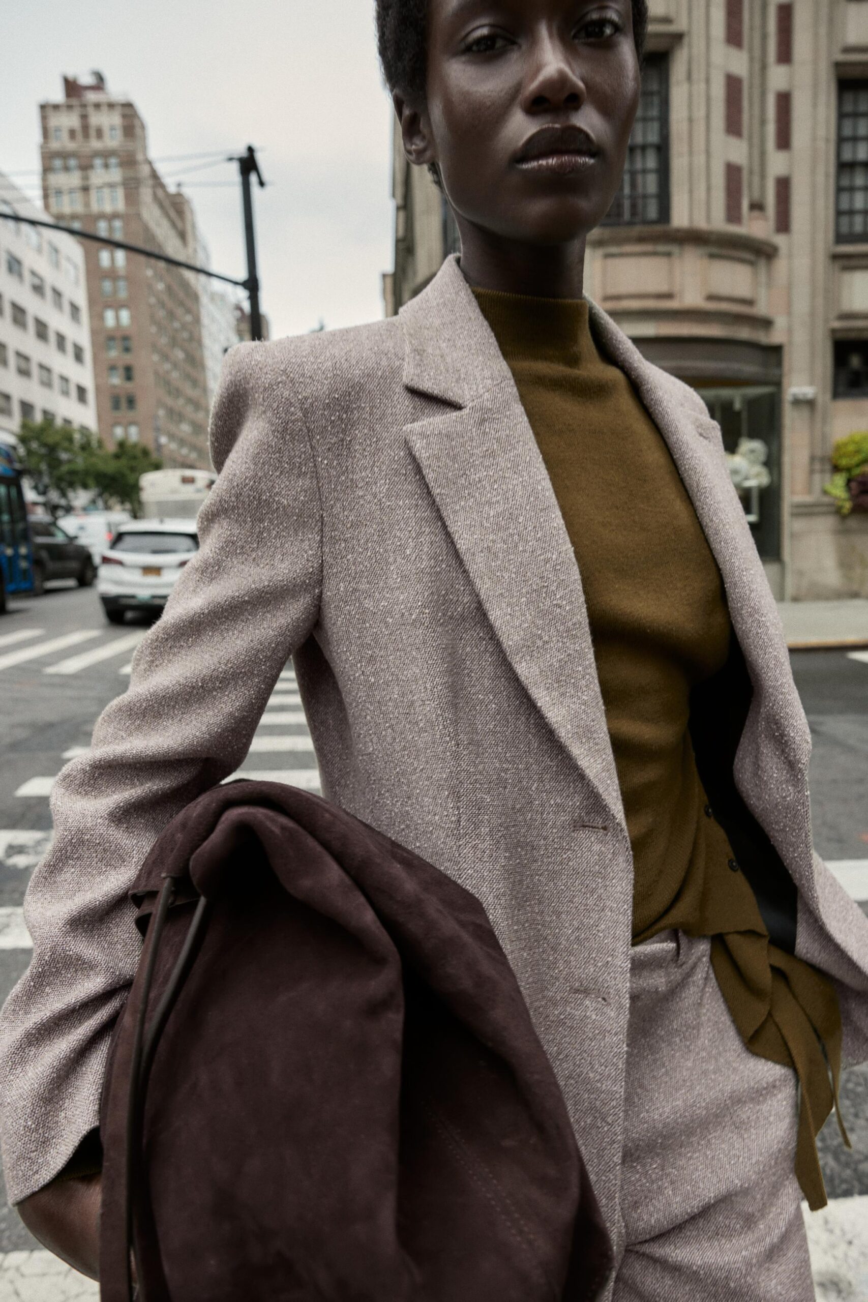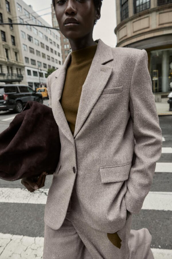 Tailored blazer with a lapel collar, long sleeves and shoulder pads. Featuring front flap pockets, a vent at the back and front button fastening.