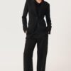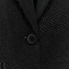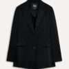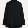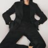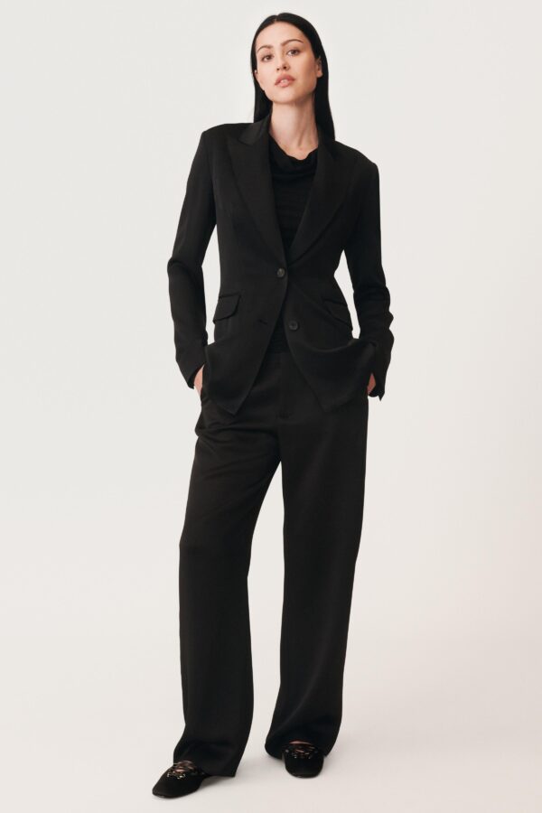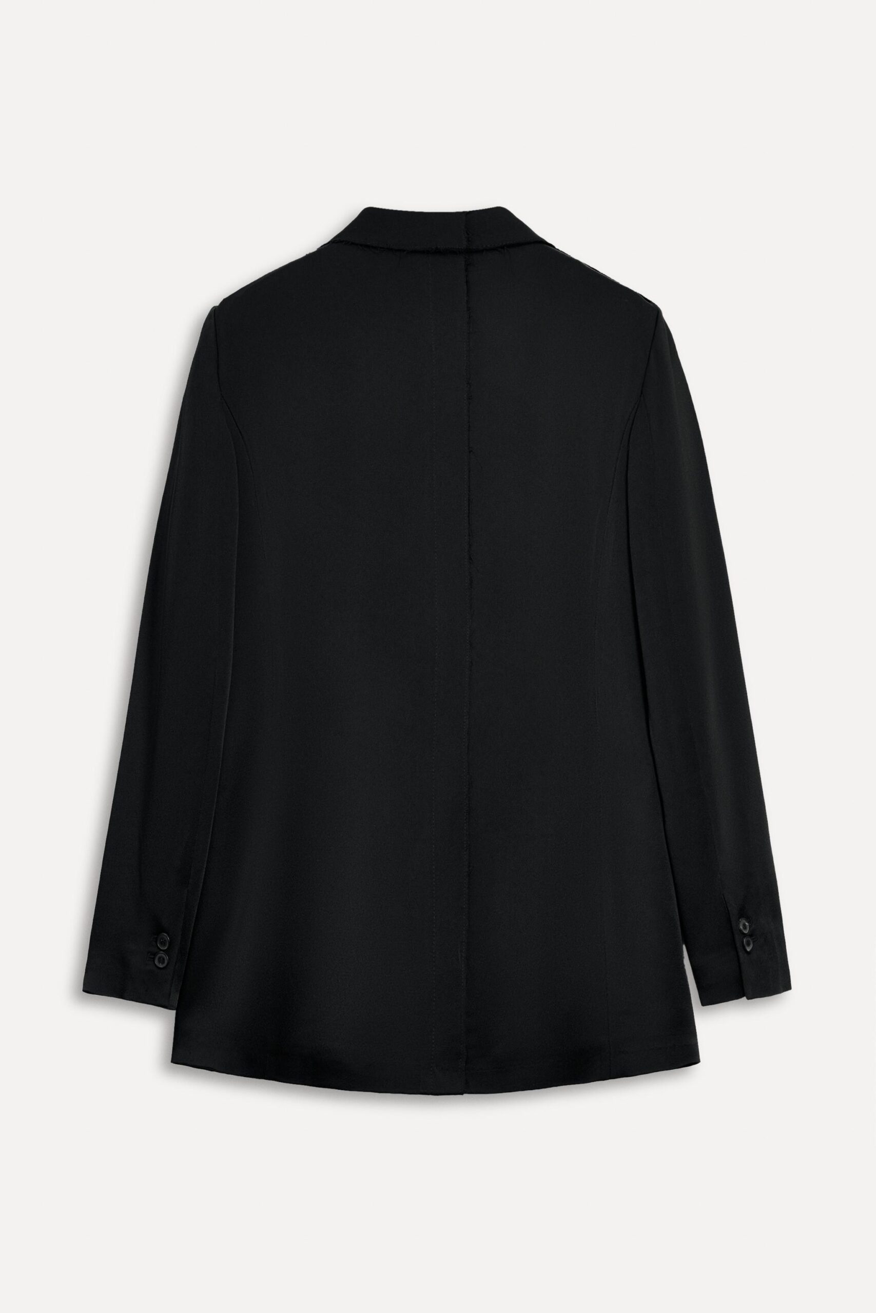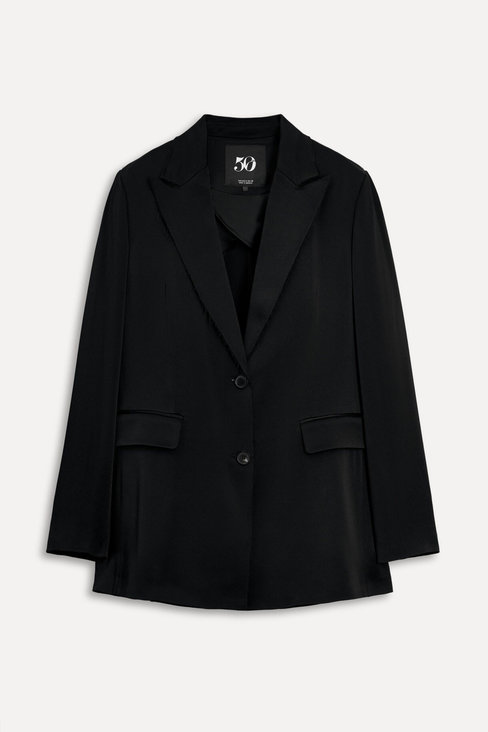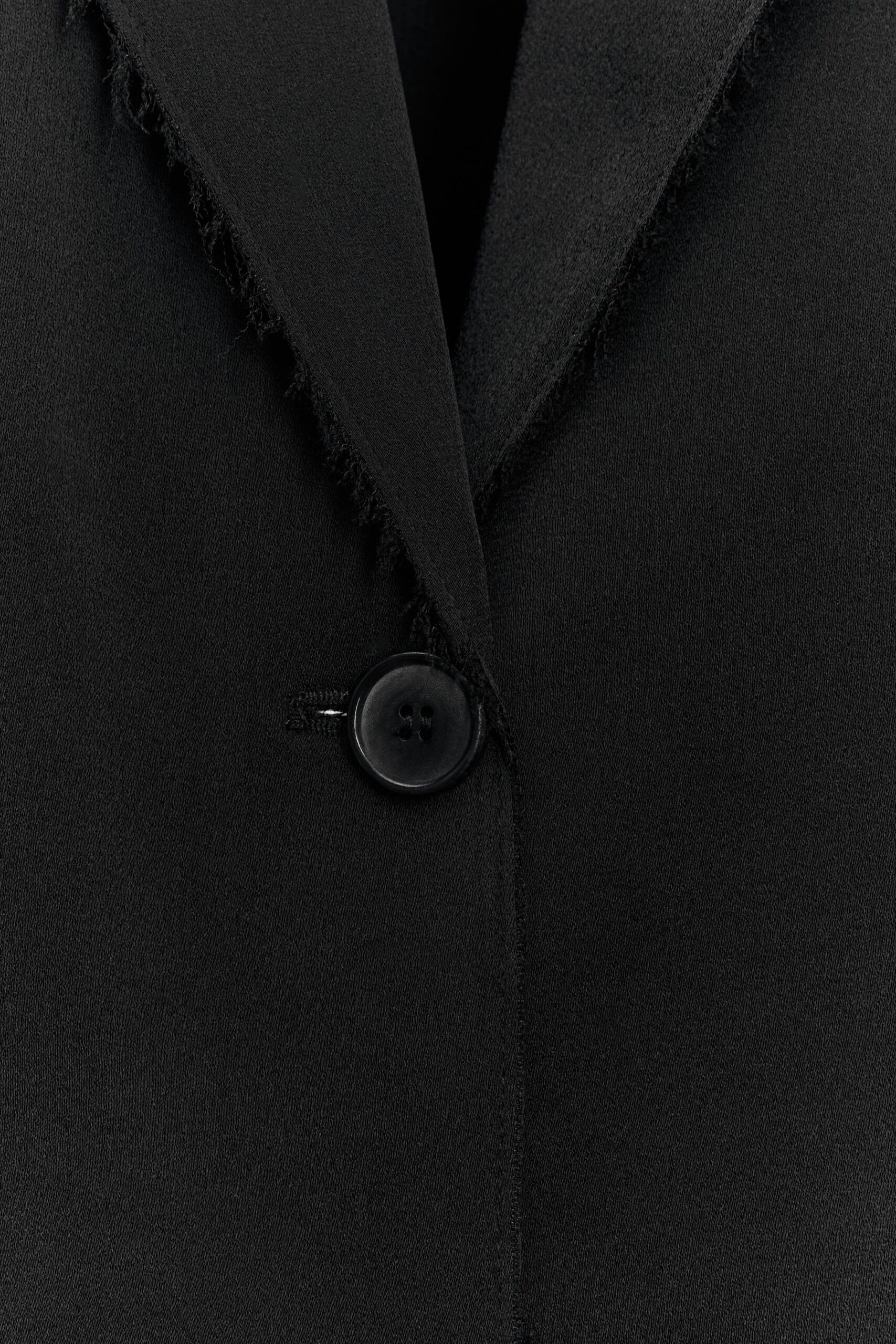 Blazer made of satin fabric. Notched lapel collar. Long sleeves with pronounced shoulders. Frayed trims. Button-up front.
