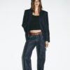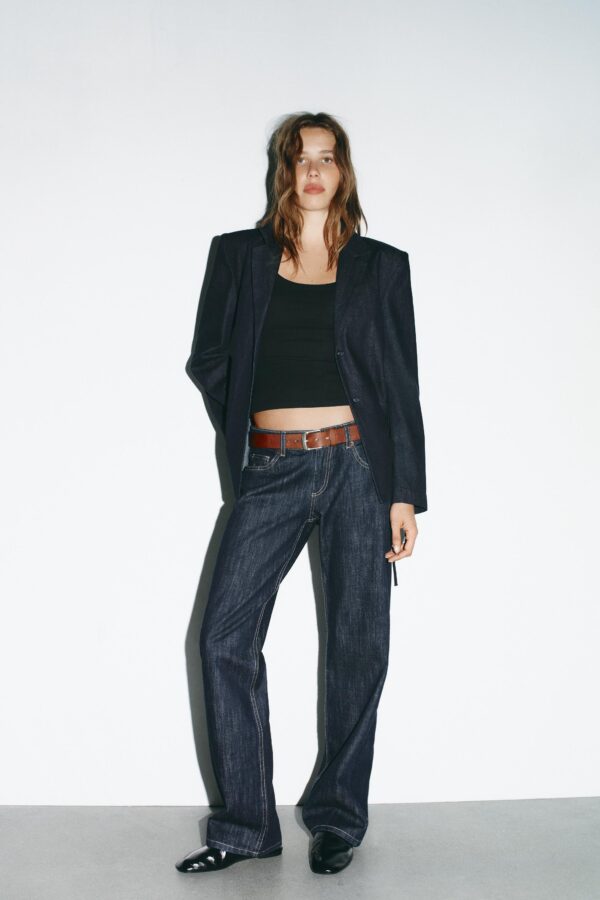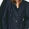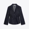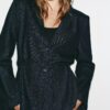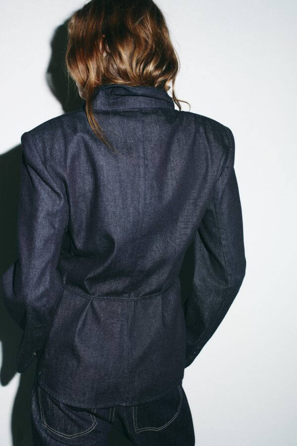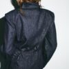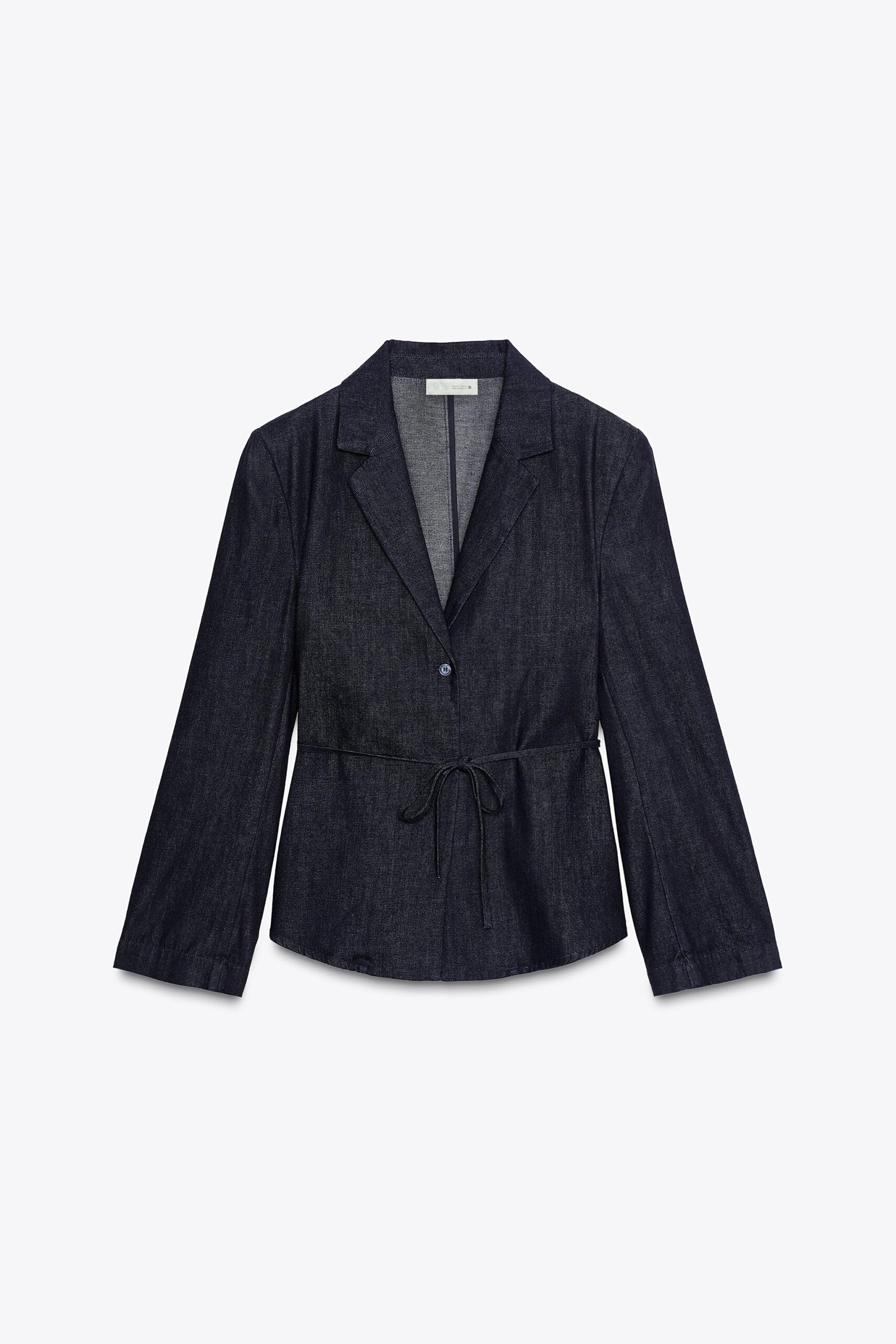 Shirt-style blazer with a lapel collar. Long sleeves with shoulder pads. Thin belt in the same fabric. Front fastening with buttons.