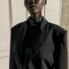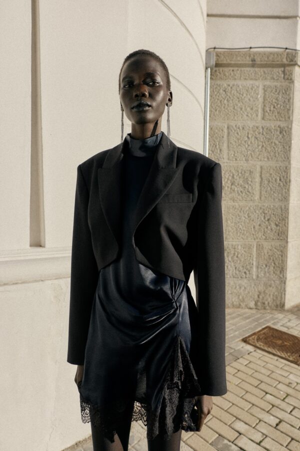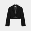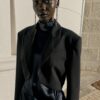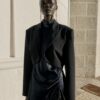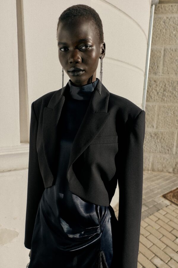 Open blazer with a lapel collar and long sleeves with shoulder pads. Featuring side pleats.