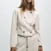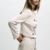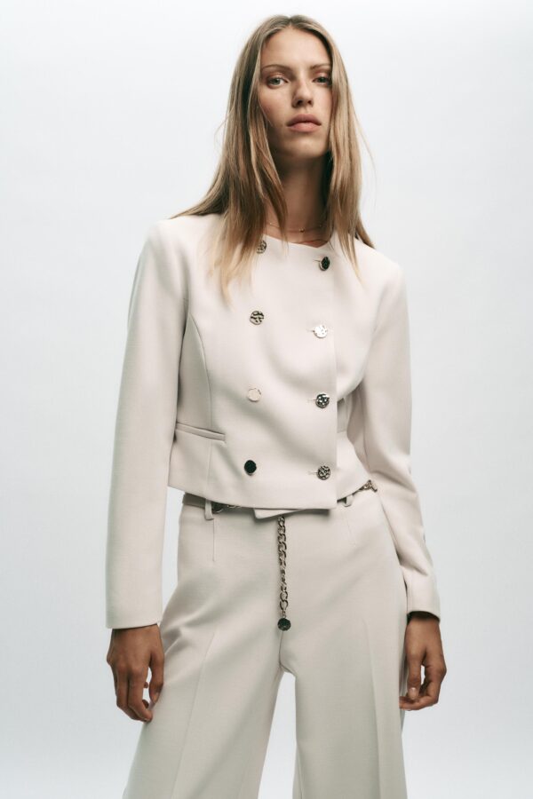 Blazer with a round neck and long sleeves. Featuring mock front welt pockets and a double-breasted button fastening at the front.