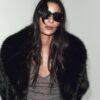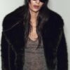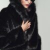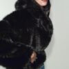 Short coat featuring a lapel collar and long sleeves. Front pockets. Front hook-and-eye fastening.