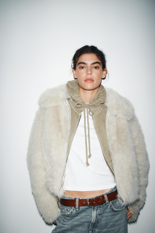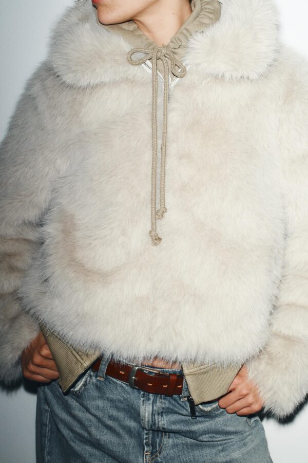Short coat with a lapel collar and long sleeves. Featuring side pockets, a matching interior lining and a zip-up front.