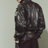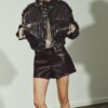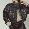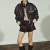 Short jacket with a high collar. Long sleeves with shoulder tabs. Flap pockets on the front. Front zip fastening and snap buttons concealed by a placket.
