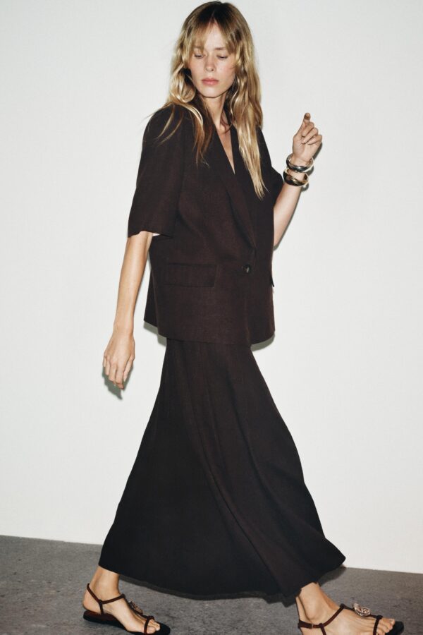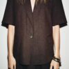Blazer made with a linen blend. Features a lapel collar, short sleeves with shoulder pads, front flap pockets and a one-button fastening.